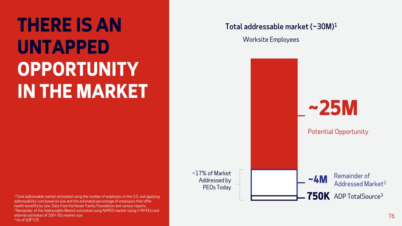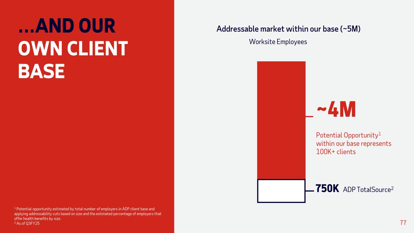 THERE IS AN UNTAPPED OPPORTUNITY IN THE MARKET 76 Worksite Employees Remainder of Addressed Market2 ADP TotalSource3 Total addressable market (~30M)1 ~4M ~25M Potential Opportunity 750K ~17% of Market Addressed by PEOs Today 1 Total addressable market estimated using the number of employers in the U.S. and applying addressability cuts based on size and the estimated percentage of employers that offer health benefits by size. Data from the Kaiser Family Foundation and various reports. 2 Remainder of the Addressable Market estimated using NAPEO market sizing (<99 EEs) and internal estimates of 100+ EEs market size. 3 As of Q3FY25