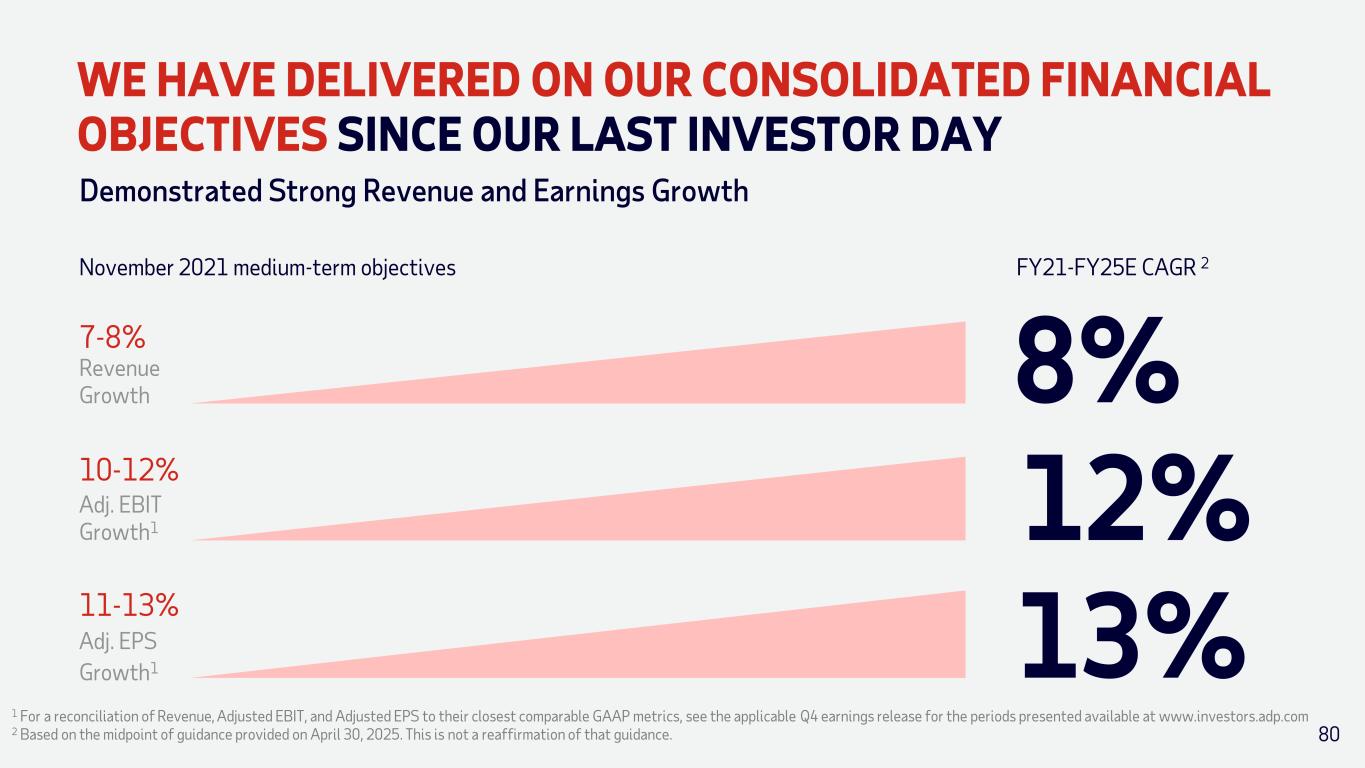 WE HAVE DELIVERED ON OUR CONSOLIDATED FINANCIAL OBJECTIVES SINCE OUR LAST INVESTOR DAY Demonstrated Strong Revenue and Earnings Growth November 2021 medium-term objectives FY21-FY25E CAGR 2 8%7-8% Revenue Growth 12%10-12% Adj. EBIT Growth1 13%11-13% Adj. EPS Growth1 1 For a reconciliation of Revenue, Adjusted EBIT, and Adjusted EPS to their closest comparable GAAP metrics, see the applicable Q4 earnings release for the periods presented available at www.investors.adp.com 2 Based on the midpoint of guidance provided on April 30, 2025. This is not a reaffirmation of that guidance. 80