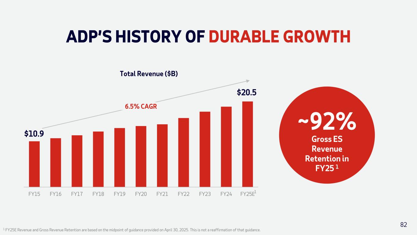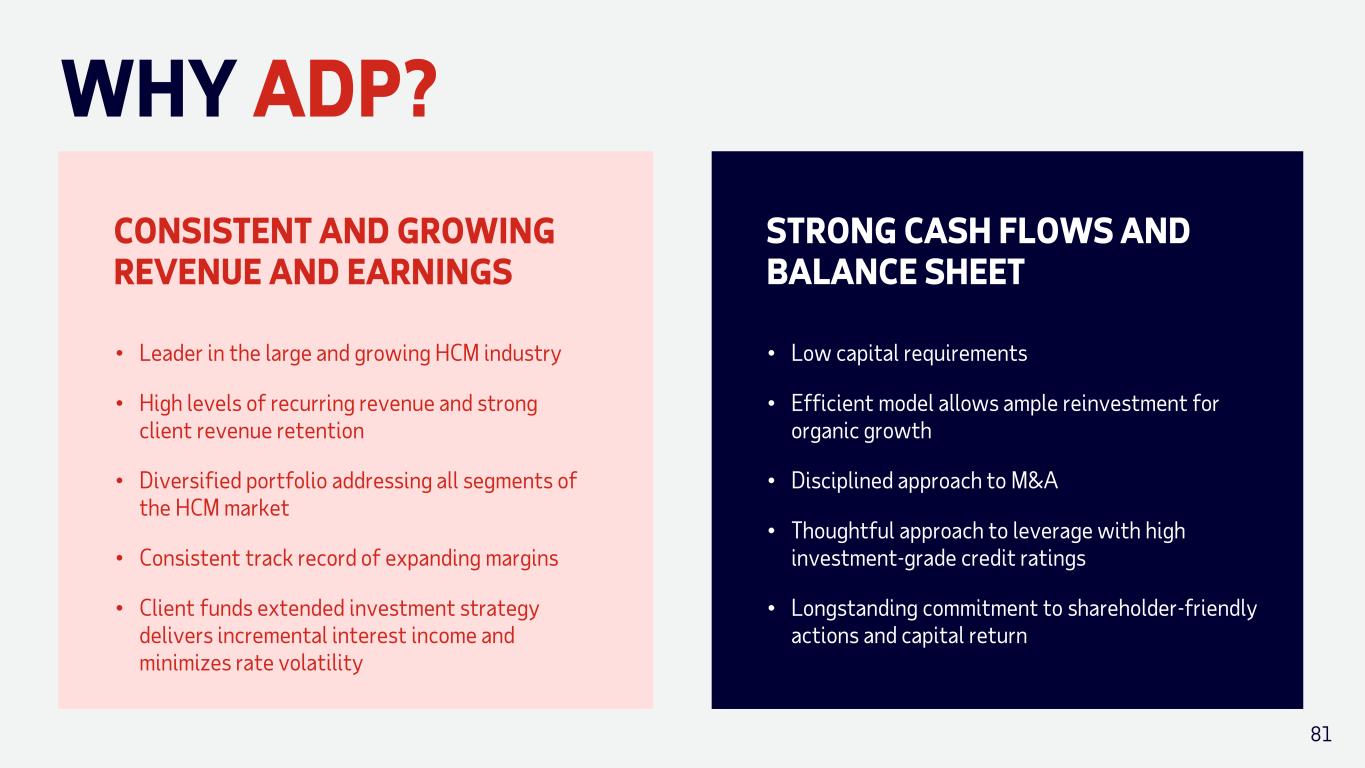 WHY ADP? CONSISTENT AND GROWING REVENUE AND EARNINGS • Leader in the large and growing HCM industry • High levels of recurring revenue and strong client revenue retention • Diversified portfolio addressing all segments of the HCM market • Consistent track record of expanding margins • Client funds extended investment strategy delivers incremental interest income and minimizes rate volatility STRONG CASH FLOWS AND BALANCE SHEET • Low capital requirements • Efficient model allows ample reinvestment for organic growth • Disciplined approach to M&A • Thoughtful approach to leverage with high investment-grade credit ratings • Longstanding commitment to shareholder-friendly actions and capital return 81