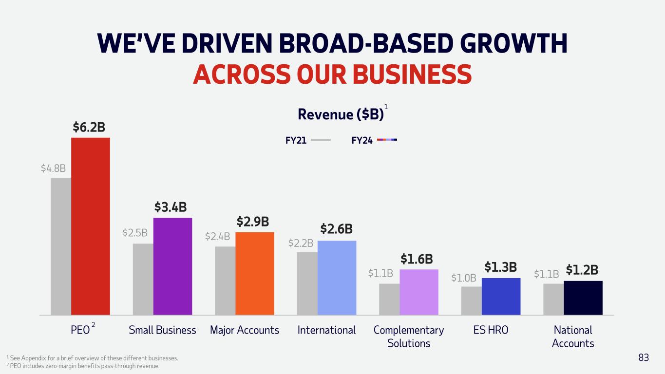 WE’VE DRIVEN BROAD-BASED GROWTH ACROSS OUR BUSINESS 83 PEO Small Business Major Accounts International Complementary Solutions ES HRO National Accounts $6.2B $4.8B $2.5B $3.4B $2.4B $2.9B $2.6B $1.6B $1.3B $1.2B $2.2B $1.1B $1.0B $1.1B FY21 FY24 Revenue ($B) 1 See Appendix for a brief overview of these different businesses. 2 PEO includes zero-margin benefits pass-through revenue. 2 1