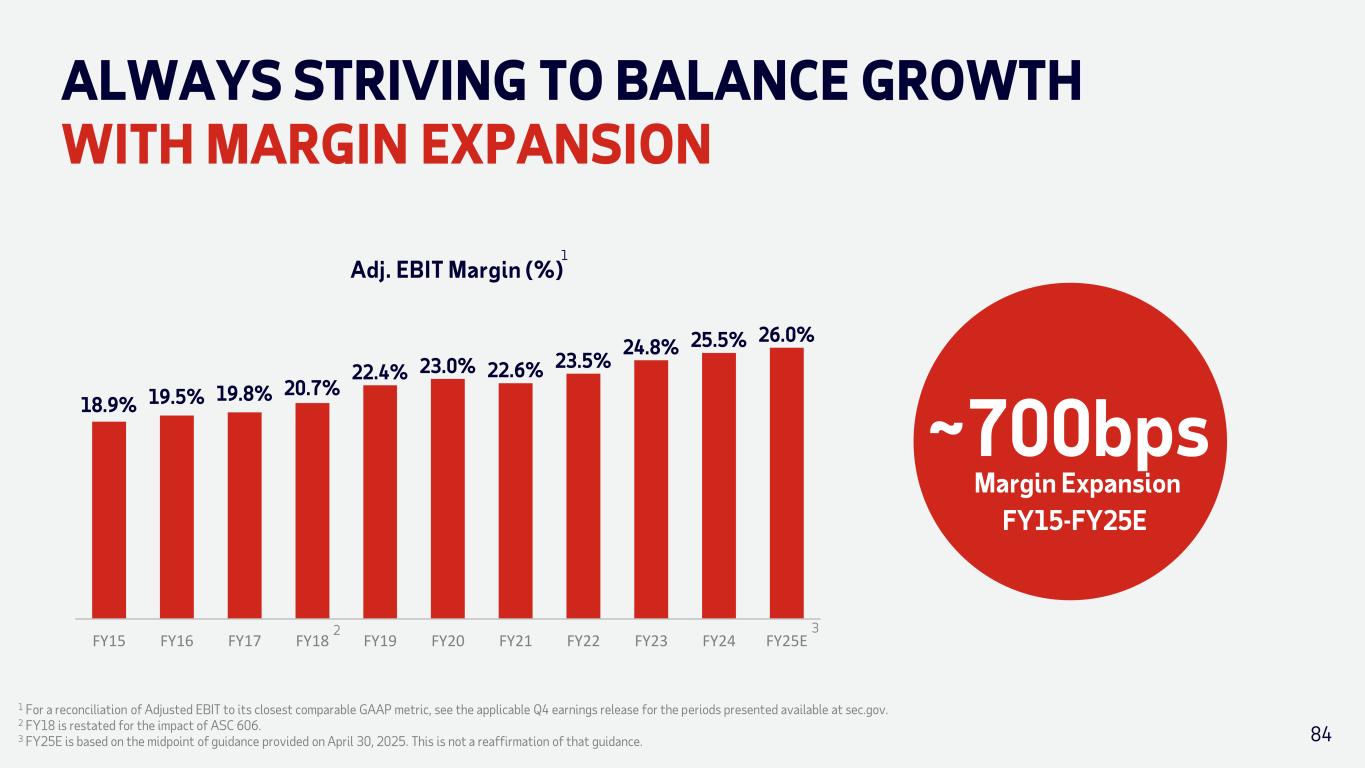 84 ALWAYS STRIVING TO BALANCE GROWTH WITH MARGIN EXPANSION ~700bps Margin Expansion FY15-FY25E 18.9% 19.5% 19.8% 20.7% 22.4% 23.0% 22.6% 23.5% 24.8% 25.5% 26.0% FY15 FY16 FY17 FY18 FY19 FY20 FY21 FY22 FY23 FY24 FY25E Adj. EBIT Margin (%) 1 For a reconciliation of Adjusted EBIT to its closest comparable GAAP metric, see the applicable Q4 earnings release for the periods presented available at sec.gov. 2 FY18 is restated for the impact of ASC 606. 3 FY25E is based on the midpoint of guidance provided on April 30, 2025. This is not a reaffirmation of that guidance. 32 1