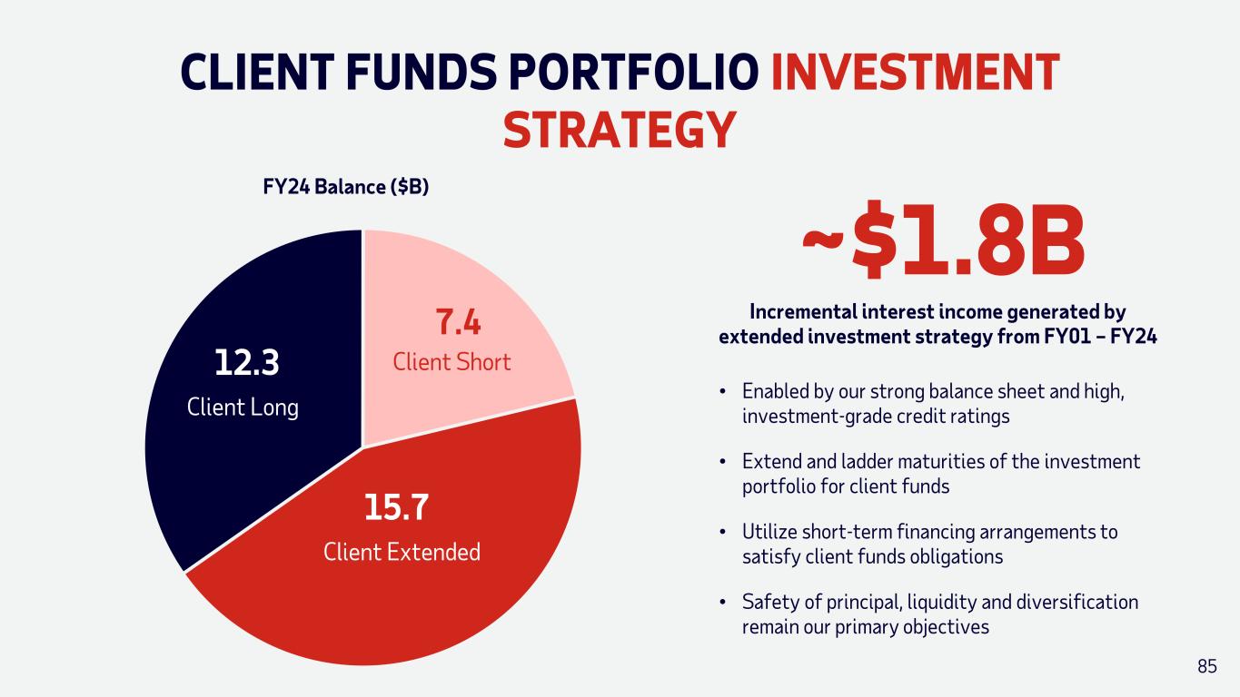 CLIENT FUNDS PORTFOLIO INVESTMENT STRATEGY FY24 Balance ($B) 12.3 Client Long 7.4 Client Short 15.7 Client Extended ~$1.8B Incremental interest income generated by extended investment strategy from FY01 – FY24 • Enabled by our strong balance sheet and high, investment-grade credit ratings • Extend and ladder maturities of the investment portfolio for client funds • Utilize short-term financing arrangements to satisfy client funds obligations • Safety of principal, liquidity and diversification remain our primary objectives 85