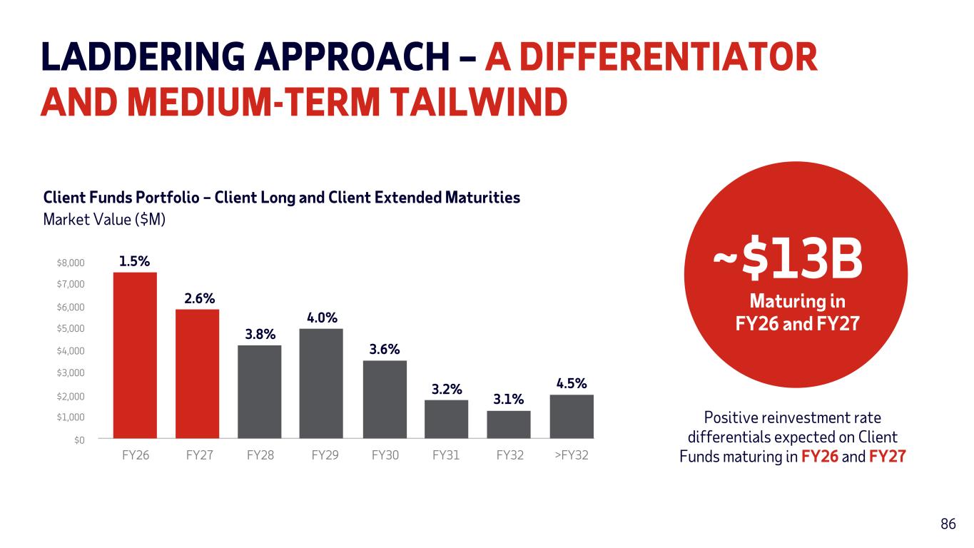 Positive reinvestment rate differentials expected on Client Funds maturing in FY26 and FY27 86 LADDERING APPROACH – A DIFFERENTIATOR AND MEDIUM-TERM TAILWIND ~$13B Maturing in FY26 and FY27 $8,000 $7,000 $6,000 $5,000 $4,000 $3,000 $2,000 $1,000 $0 FY26 FY27 FY28 FY29 FY30 FY31 FY32 >FY32 1.5% 2.6% 3.8% 4.0% 3.6% 3.2% 3.1% 4.5% Client Funds Portfolio – Client Long and Client Extended Maturities Market Value ($M) 86