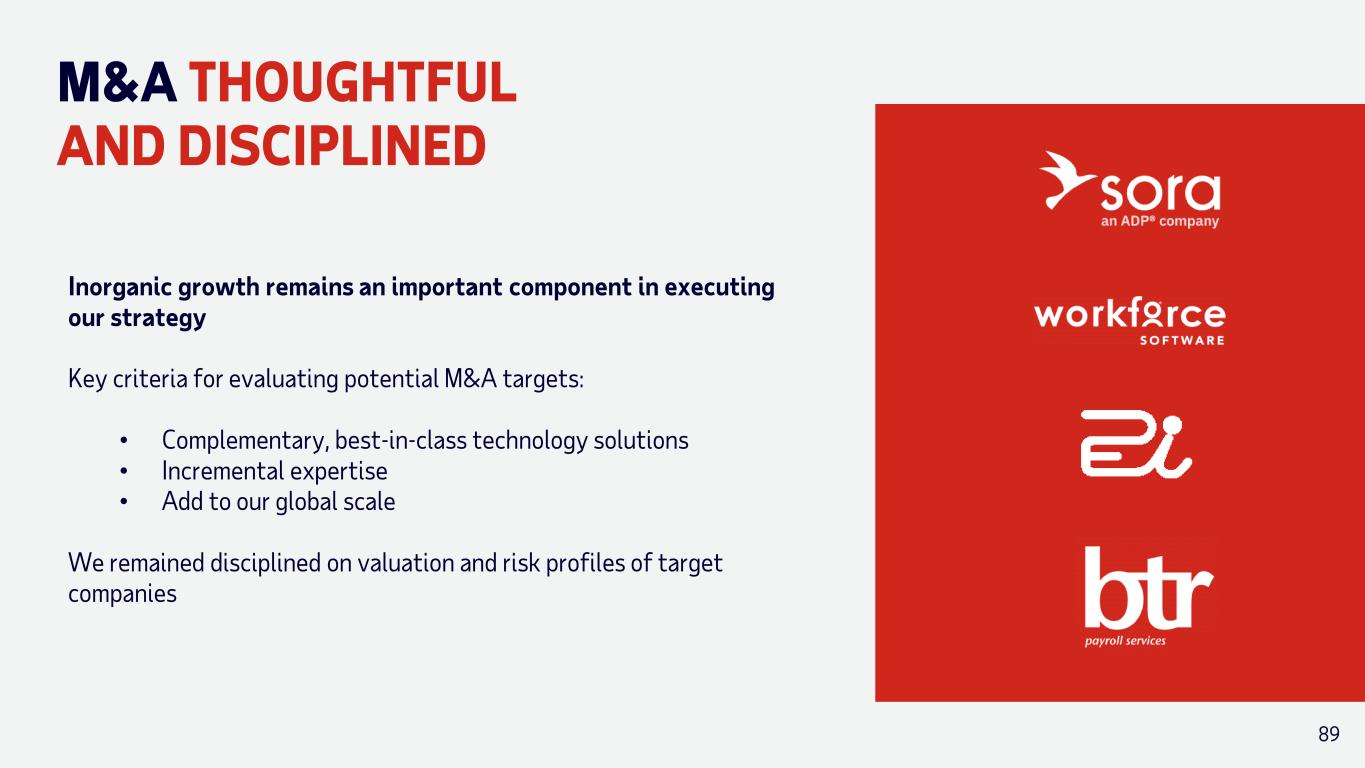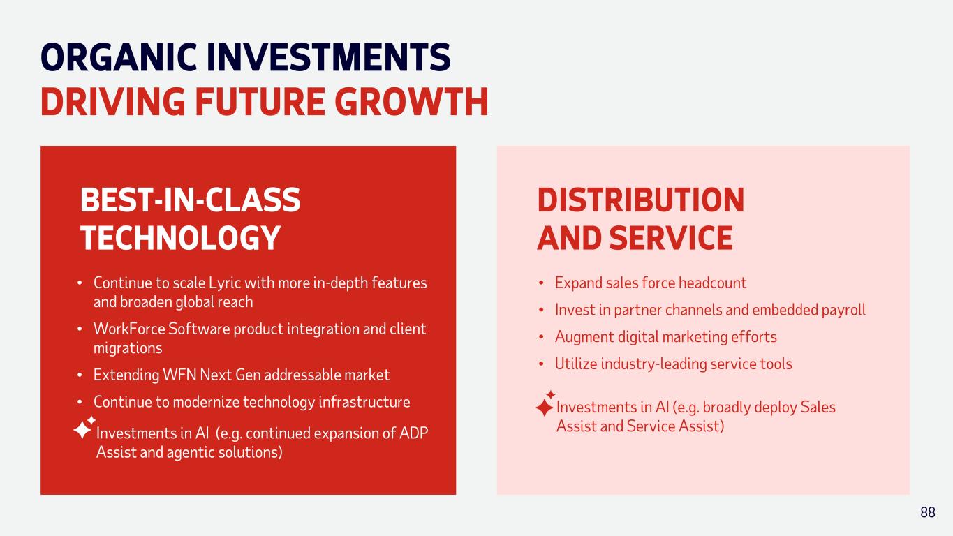 ORGANIC INVESTMENTS DRIVING FUTURE GROWTH BEST-IN-CLASS TECHNOLOGY • Continue to scale Lyric with more in-depth features and broaden global reach • WorkForce Software product integration and client migrations • Extending WFN Next Gen addressable market • Continue to modernize technology infrastructure Investments in AI (e.g. continued expansion of ADP Assist and agentic solutions) DISTRIBUTION AND SERVICE • Expand sales force headcount • Invest in partner channels and embedded payroll • Augment digital marketing efforts • Utilize industry-leading service tools Investments in AI (e.g. broadly deploy Sales Assist and Service Assist) 88
