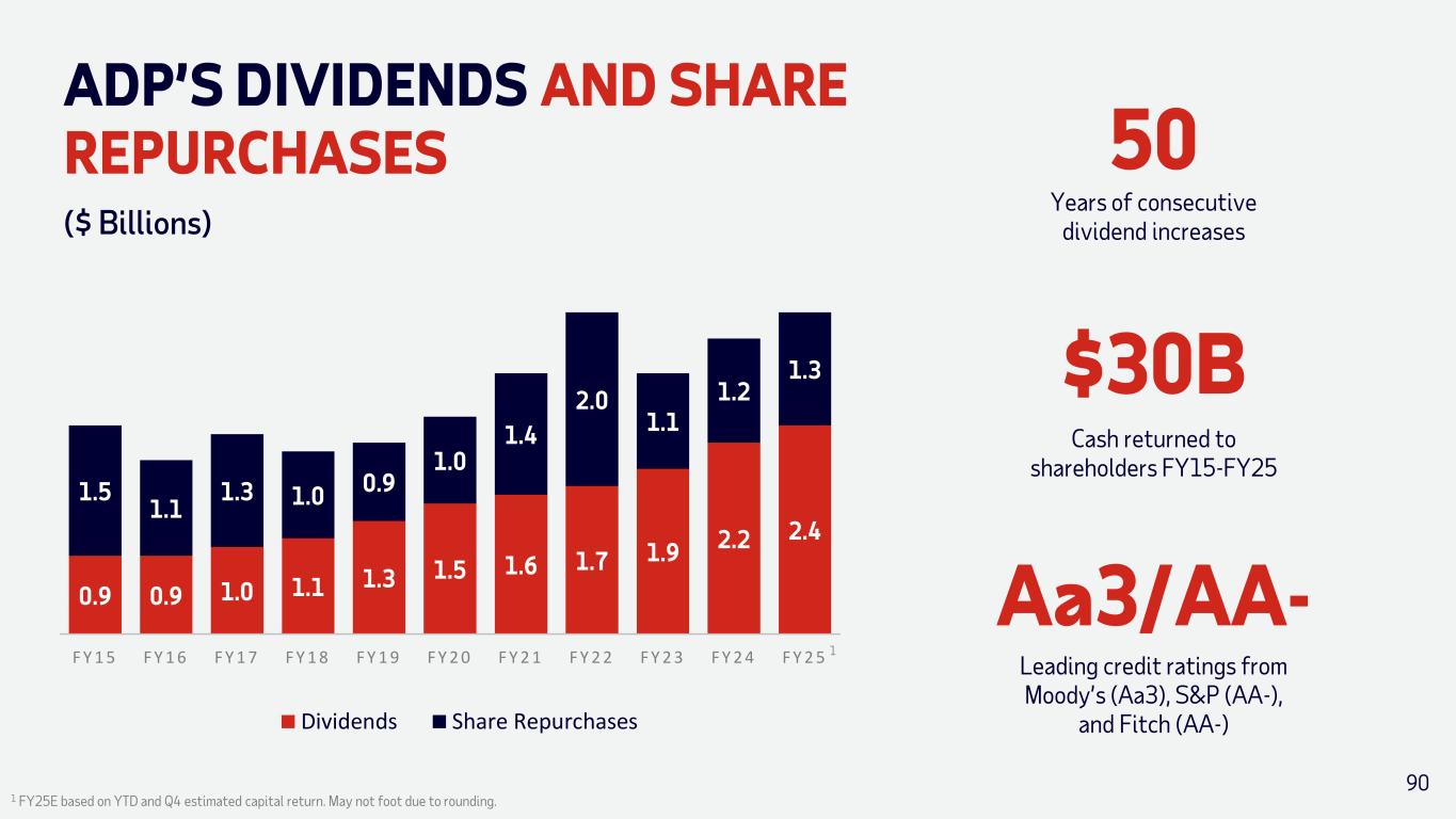 ADP’S DIVIDENDS AND SHARE REPURCHASES 0.9 0.9 1.0 1.1 1.3 1.5 1.6 1.7 1.9 2.2 2.4 1.5 1.1 1.3 1.0 0.9 1.0 1.4 2.0 1.1 1.2 1.3 F Y 1 5 F Y 1 6 F Y 1 7 F Y 1 8 F Y 1 9 F Y 2 0 F Y 2 1 F Y 2 2 F Y 2 3 F Y 2 4 F Y 2 5 Dividends Share Repurchases ($ Billions) 50 Years of consecutive dividend increases $30B Cash returned to shareholders FY15-FY25 Aa3/AA- Leading credit ratings from Moody’s (Aa3), S&P (AA-), and Fitch (AA-) 1 FY25E based on YTD and Q4 estimated capital return. May not foot due to rounding. 1 90