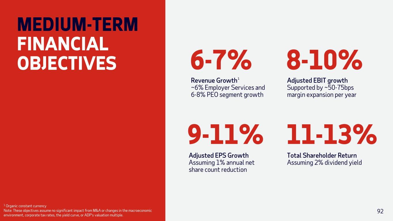 MEDIUM-TERM FINANCIAL OBJECTIVES 8-10% Adjusted EBIT growth Supported by ~50-75bps margin expansion per year 9-11% Adjusted EPS Growth Assuming 1% annual net share count reduction 92 11-13% Total Shareholder Return Assuming 2% dividend yield 1 Organic constant currency Note: These objectives assume no significant impact from M&A or changes in the macroeconomic environment, corporate tax rates, the yield curve, or ADP’s valuation multiple. 6-7% Revenue Growth ~6% Employer Services and 6-8% PEO segment growth 1