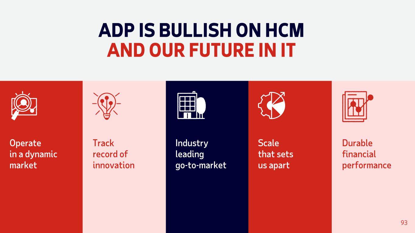 ADP IS BULLISH ON HCM AND OUR FUTURE IN IT Industry leading go-to-market Scale that sets us apart Operate in a dynamic market Durable financial performance Track record of innovation 93