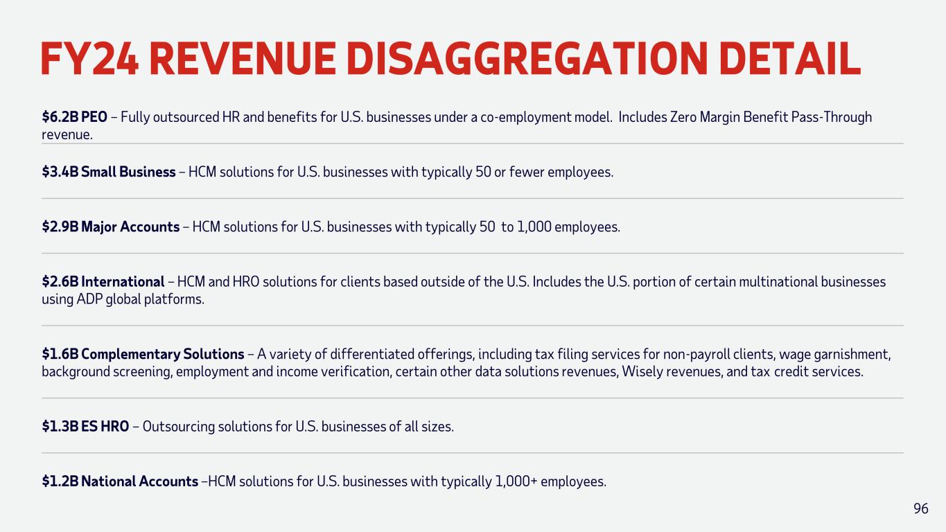 FY24 REVENUE DISAGGREGATION DETAIL $6.2B PEO – Fully outsourced HR and benefits for U.S. businesses under a co-employment model. Includes Zero Margin Benefit Pass-Through revenue. $3.4B Small Business – HCM solutions for U.S. businesses with typically 50 or fewer employees. $2.9B Major Accounts – HCM solutions for U.S. businesses with typically 50 to 1,000 employees. $2.6B International – HCM and HRO solutions for clients based outside of the U.S. Includes the U.S. portion of certain multinational businesses using ADP global platforms. $1.6B Complementary Solutions – A variety of differentiated offerings, including tax filing services for non-payroll clients, wage garnishment, background screening, employment and income verification, certain other data solutions revenues, Wisely revenues, and tax credit services. $1.2B National Accounts –HCM solutions for U.S. businesses with typically 1,000+ employees. $1.3B ES HRO – Outsourcing solutions for U.S. businesses of all sizes. 96
