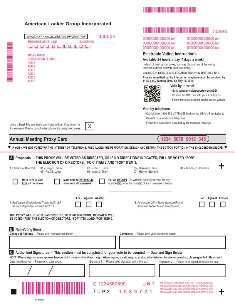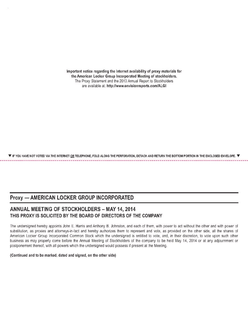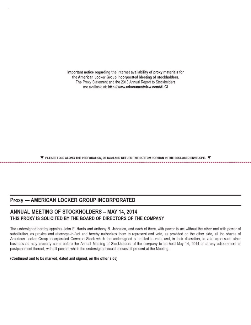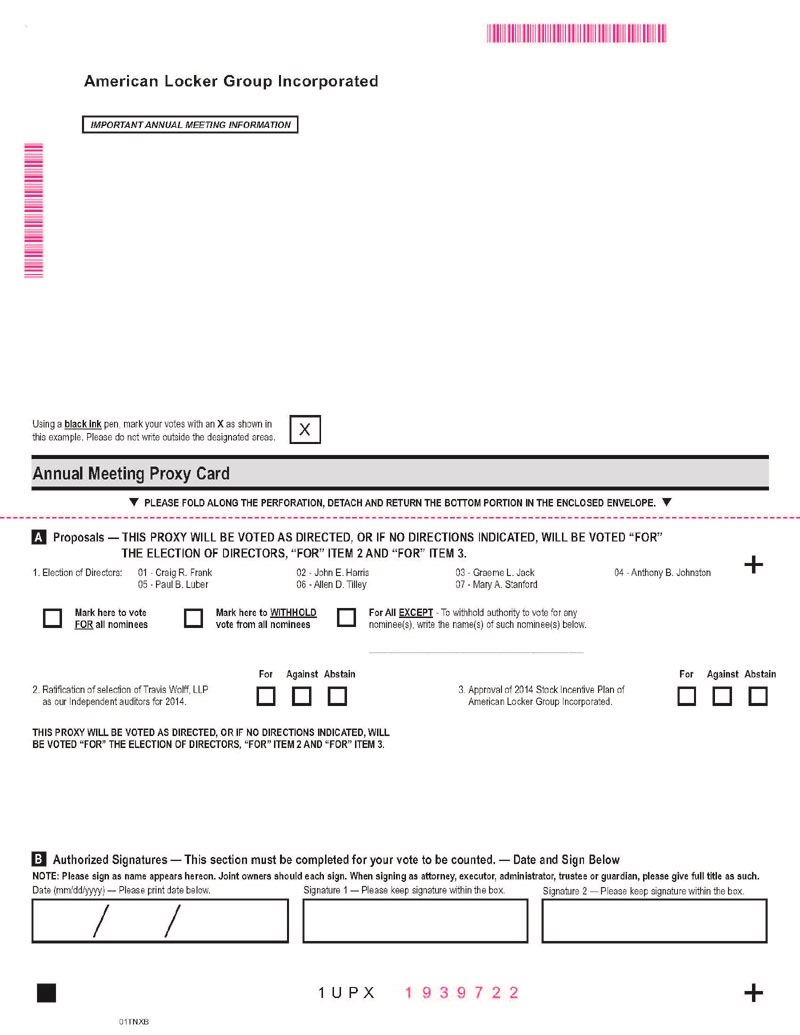 You are cordially invited to attend the 2014 Annual Meeting of Stockholders of American Locker Group Incorporated to be held on May 14, 2014 at 9:00 a.m., local time, at 2701 Regent Boulevard, Suite 200, DFW Airport, Texas 75261. Please find enclosed a notice to stockholders, a Proxy Statement describing the business to be transacted at the annual meeting, a proxy card for use in voting at the meeting and American Locker Group Incorporated’s Annual Report on Form 10-K for the year ended December 31, 2013.