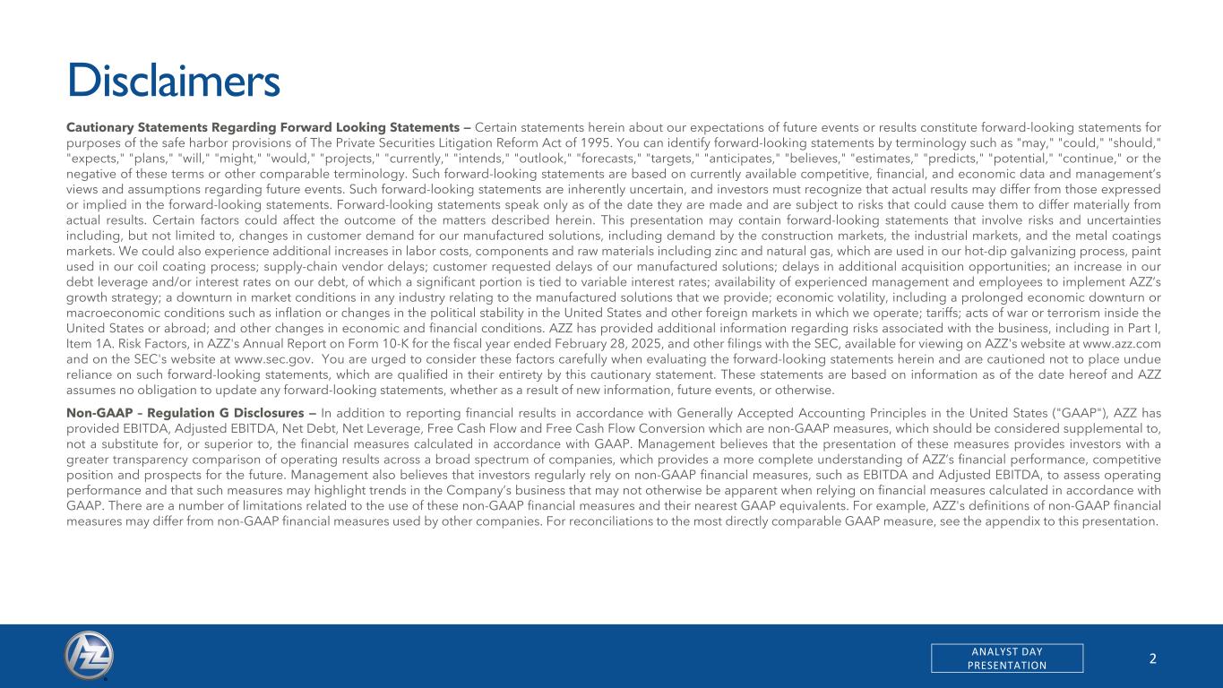 2ANALYST DAY PRESENTATION Disclaimers Cautionary Statements Regarding Forward Looking Statements — Certain statements herein about our expectations of future events or results constitute forward-looking statements for purposes of the safe harbor provisions of The Private Securities Litigation Reform Act of 1995. You can identify forward-looking statements by terminology such as "may," "could," "should," "expects," "plans," "will," "might," "would," "projects," "currently," "intends," "outlook," "forecasts," "targets," "anticipates," "believes," "estimates," "predicts," "potential," "continue," or the negative of these terms or other comparable terminology. Such forward-looking statements are based on currently available competitive, financial, and economic data and management’s views and assumptions regarding future events. Such forward-looking statements are inherently uncertain, and investors must recognize that actual results may differ from those expressed or implied in the forward-looking statements. Forward-looking statements speak only as of the date they are made and are subject to risks that could cause them to differ materially from actual results. Certain factors could affect the outcome of the matters described herein. This presentation may contain forward-looking statements that involve risks and uncertainties including, but not limited to, changes in customer demand for our manufactured solutions, including demand by the construction markets, the industrial markets, and the metal coatings markets. We could also experience additional increases in labor costs, components and raw materials including zinc and natural gas, which are used in our hot-dip galvanizing process, paint used in our coil coating process; supply-chain vendor delays; customer requested delays of our manufactured solutions; delays in additional acquisition opportunities; an increase in our debt leverage and/or interest rates on our debt, of which a significant portion is tied to variable interest rates; availability of experienced management and employees to implement AZZ’s growth strategy; a downturn in market conditions in any industry relating to the manufactured solutions that we provide; economic volatility, including a prolonged economic downturn or macroeconomic conditions such as inflation or changes in the political stability in the United States and other foreign markets in which we operate; tariffs; acts of war or terrorism inside the United States or abroad; and other changes in economic and financial conditions. AZZ has provided additional information regarding risks associated with the business, including in Part I, Item 1A. Risk Factors, in AZZ's Annual Report on Form 10-K for the fiscal year ended February 28, 2025, and other filings with the SEC, available for viewing on AZZ's website at www.azz.com and on the SEC's website at www.sec.gov. You are urged to consider these factors carefully when evaluating the forward-looking statements herein and are cautioned not to place undue reliance on such forward-looking statements, which are qualified in their entirety by this cautionary statement. These statements are based on information as of the date hereof and AZZ assumes no obligation to update any forward-looking statements, whether as a result of new information, future events, or otherwise. Non-GAAP – Regulation G Disclosures — In addition to reporting financial results in accordance with Generally Accepted Accounting Principles in the United States ("GAAP"), AZZ has provided EBITDA, Adjusted EBITDA, Net Debt, Net Leverage, Free Cash Flow and Free Cash Flow Conversion which are non-GAAP measures, which should be considered supplemental to, not a substitute for, or superior to, the financial measures calculated in accordance with GAAP. Management believes that the presentation of these measures provides investors with a greater transparency comparison of operating results across a broad spectrum of companies, which provides a more complete understanding of AZZ’s financial performance, competitive position and prospects for the future. Management also believes that investors regularly rely on non-GAAP financial measures, such as EBITDA and Adjusted EBITDA, to assess operating performance and that such measures may highlight trends in the Company’s business that may not otherwise be apparent when relying on financial measures calculated in accordance with GAAP. There are a number of limitations related to the use of these non-GAAP financial measures and their nearest GAAP equivalents. For example, AZZ's definitions of non-GAAP financial measures may differ from non-GAAP financial measures used by other companies. For reconciliations to the most directly comparable GAAP measure, see the appendix to this presentation.