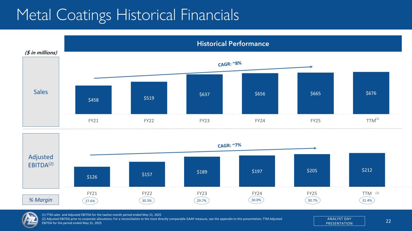 21ANALYST DAY PRESENTATION Metal Coatings Footprint Well-Positioned to Serve Key End-Markets Superior Capabilities Enable Leading Position Across All End-Markets2 North America’s leading post-fabrication hot-dip galvanizer with unmatched competitive moat Spin GalvanizingHot-Dip Galvanizing Powder Coating Anodizing and Plating State-of-the-Art Facilities Across North America(1) Construction 26% Industrial 20% Transportation 16% Electrical 20% Other 18% Key Technologies (1) 42 galvanizing locations and 4 surface technologies locations as of July 1, 2025 (2) Based on AZZ Q1 FY2026 financial results ended May 31, 2025 10
