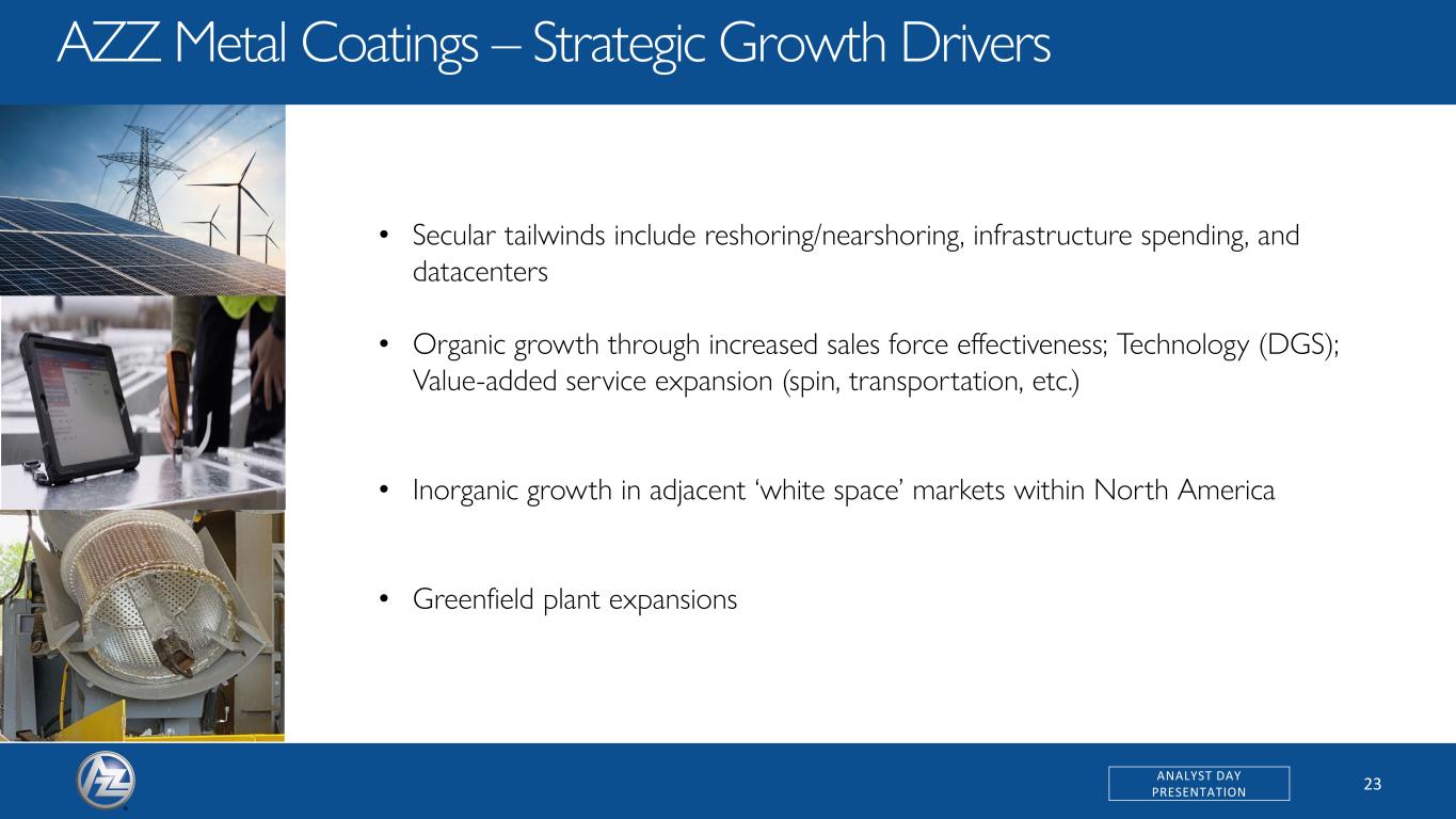 23ANALYST DAY PRESENTATION AZZ Metal Coatings – Strategic Growth Drivers • Secular tailwinds include reshoring/nearshoring, infrastructure spending, and datacenters • Organic growth through increased sales force effectiveness; Technology (DGS); Value-added service expansion (spin, transportation, etc.) • Inorganic growth in adjacent ‘white space’ markets within North America • Greenfield plant expansions