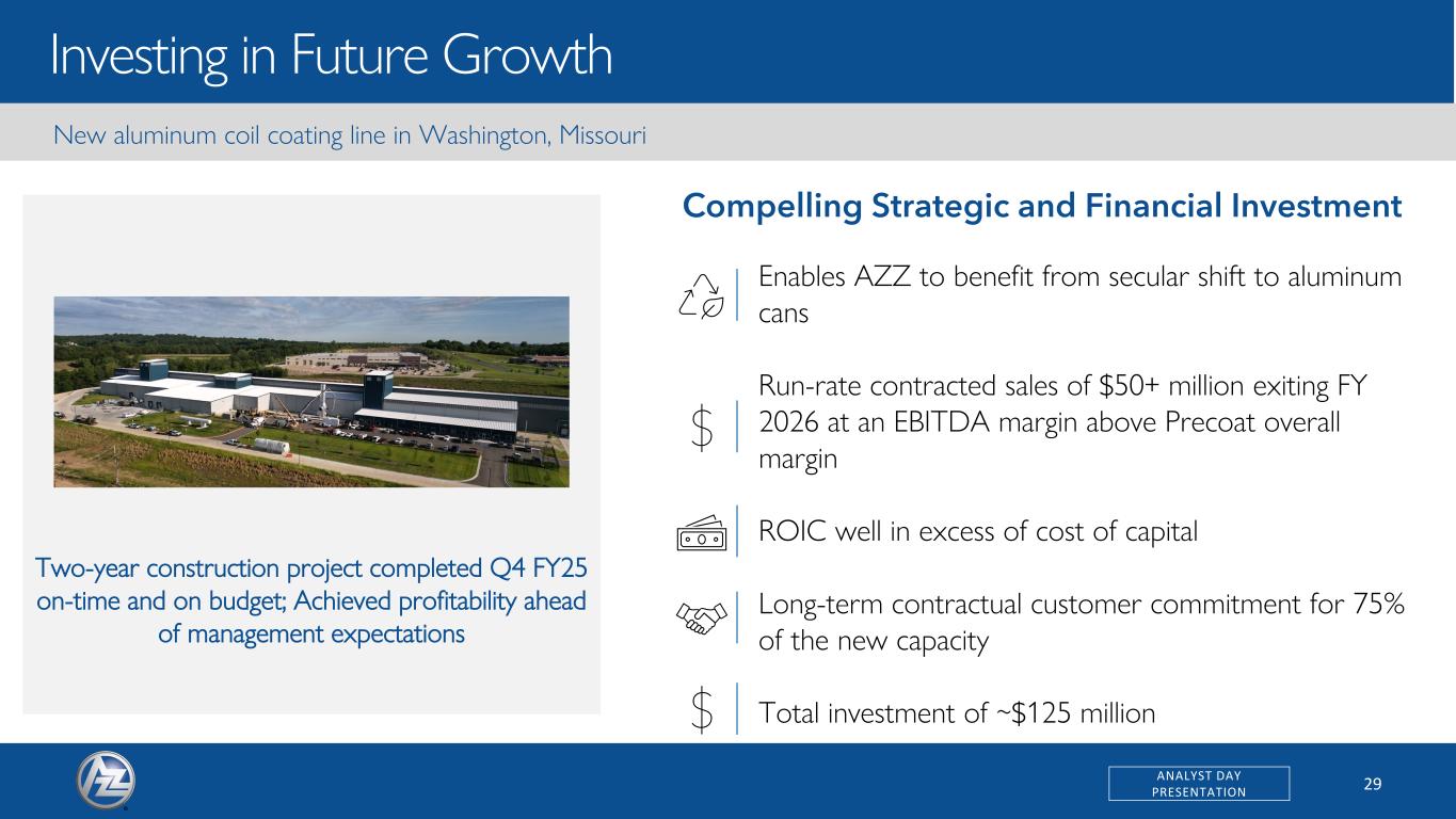 28ANALYST DAY PRESENTATION Precoat Metals Historical Financials $605 $710 $882 $881 $913 $911 FY21 FY22 FY23 FY24 FY25 TTM5 $115 $155 $165 $168 $179 $180 18.9% 21.8% 18.7% 19.0% 19.6% 19.8% FY21 FY22 FY23 FY24 FY25 TTM Sales Adjusted EBITDA3 ($ in millions) Historical Performance 13 % Margin Note: FY based on February year-end (1) Precoat sales for FY 21 – FY 22 net of external claims (2) Fiscal year 2023 Precoat Sales and EBITDA are adjusted to include results from March 1, 2022 to May 13, 2022 prior to completion of acquisition on May 13, 2022 (3) Adjusted EBITDA prior to corporate allocations; For a reconciliation to the most directly comparable GAAP measure, see the appendix to this presentation (4) Precoat EBITDA for FY 21 – FY 22 excludes buy-side standalone diligence adjustments made by AZZ (5) TTM reflects results for the twelve-month period ended May 31, 2025 2 2 1 1 1 4 4 4 5