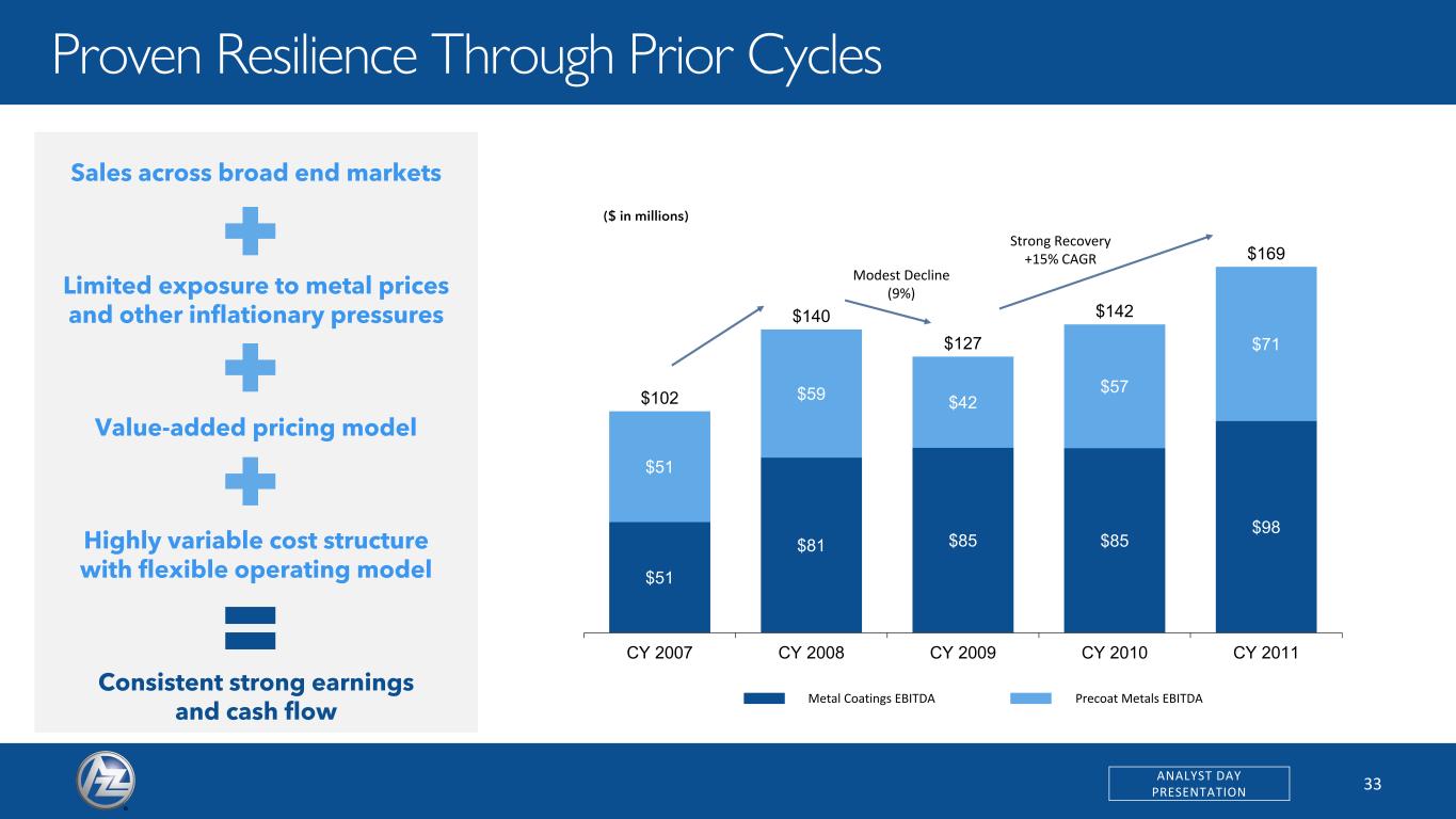 32ANALYST DAY PRESENTATION Precoat MetalsMetal Coatings COVID Year $458 $519 $637 $656 $665 $676 $605 $710 $882 $881 $913 $911 FY21 FY22 FY23 FY24 FY25 TTM $1,062 $1,229 $1,519 $1,538 $241 $312 $354 $364 Sales Segment Adjusted EBITDA3 Excl. Corporate Costs Consistent Top-Line Growth and Profitability 15 % Margin Note: FY based on February year-end financial results; Financials exclude AIS which was divested in September 2022; Please reference Appendix for LTM reconciliation (Reg G) (1) Precoat sales for FY 21 – FY 22 net of external claims (2) Fiscal year 2023 Precoat Sales and EBITDA are adjusted to include results from March 1, 2022 to May 13, 2022 prior to completion of acquisition on May 13, 2022 (3) Adjusted EBITDA excludes corporate costs and AVAIL JV results (4) Precoat EBITDA for FY 21 – FY 22 excludes buy-side standalone diligence adjustments made by AZZ (5) TTM reflects the twelve-month period ended May 31, 2025 2 1 1 1 $1,578 $384 $1,587 $392 5 5 ($ in millions) 2 5 4 4 4 COVID Year