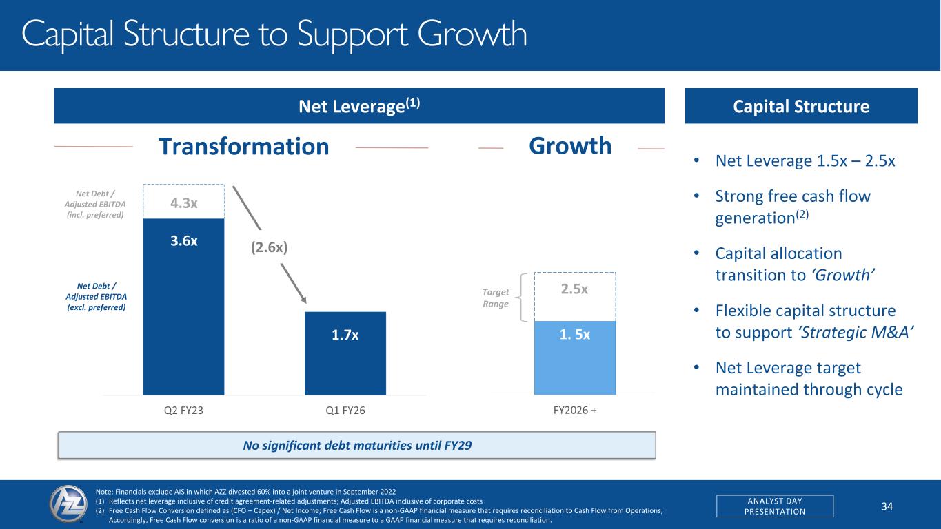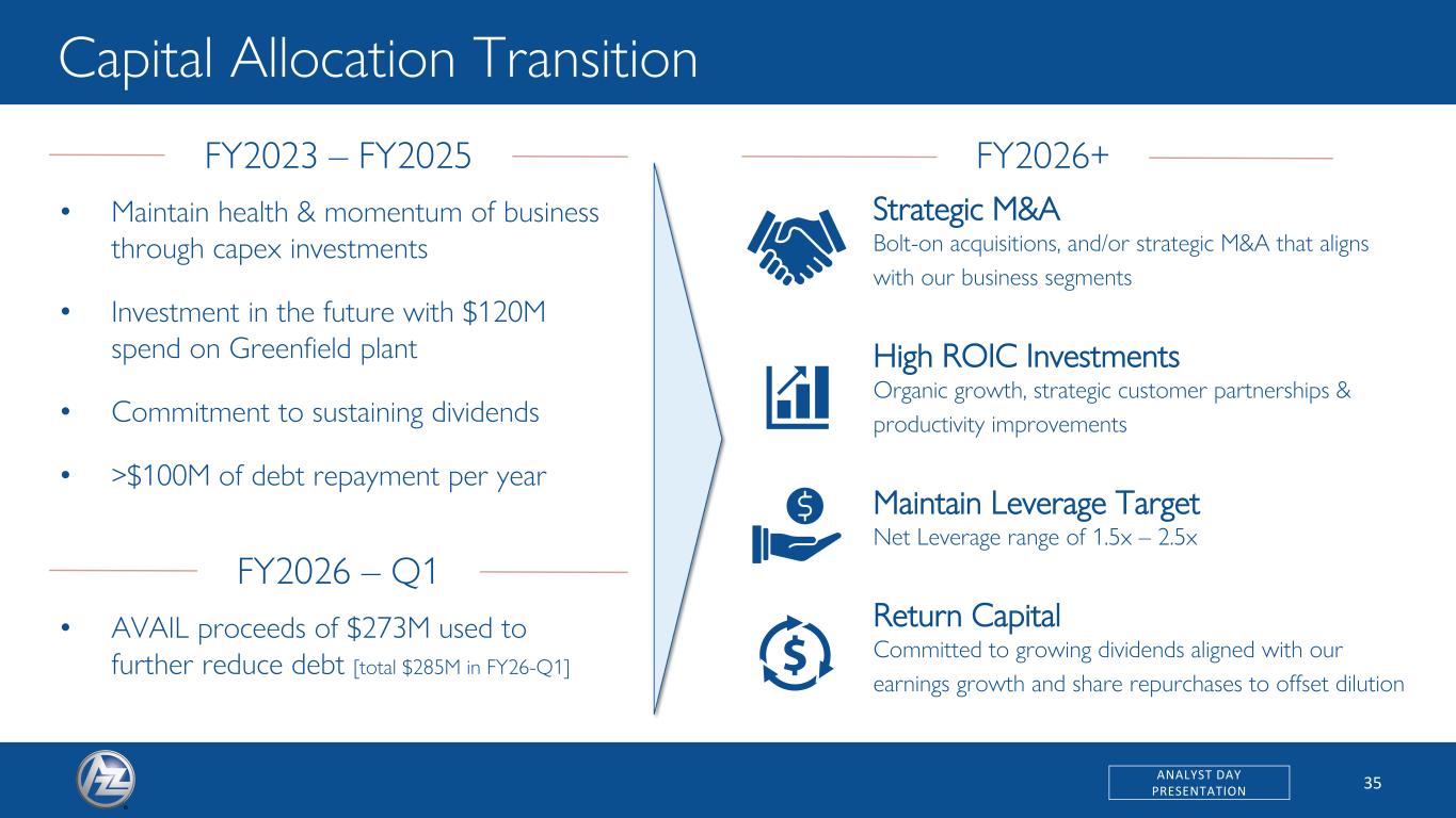 34ANALYST DAY PRESENTATION Capital Structure to Support Growth Note: Financials exclude AIS in which AZZ divested 60% into a joint venture in September 2022 (1) Reflects net leverage inclusive of credit agreement-related adjustments; Adjusted EBITDA inclusive of corporate costs (2) Free Cash Flow Conversion defined as (CFO – Capex) / Net Income; Free Cash Flow is a non-GAAP financial measure that requires reconciliation to Cash Flow from Operations; Accordingly, Free Cash Flow conversion is a ratio of a non-GAAP financial measure to a GAAP financial measure that requires reconciliation. 16 No significant debt maturities until FY29 Transformation Growth Q2 FY23 Q1 FY26 (2.6x) 1.7x 4.3x 3.6x 2.5x 1.5x Net Leverage(1) • Net Leverage 1.5x – 2.5x • Strong free cash flow generation(2) • Capital allocation transition to ‘Growth’ • Flexible capital structure to support ‘Strategic M&A’ • Net Leverage target maintained through cycle Net Debt / Adjusted EBITDA (excl. preferred) Net Debt / Adjusted EBITDA (incl. preferred) Target Range Capital Structure