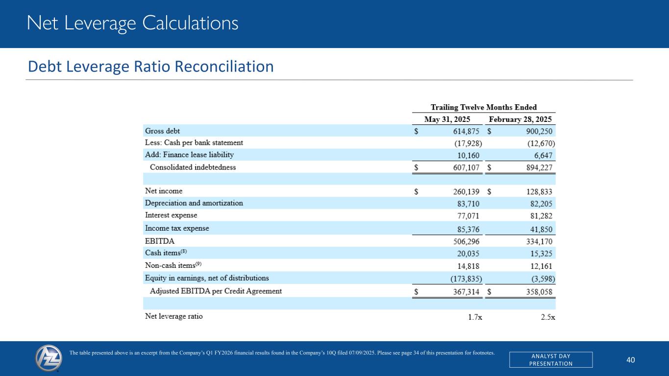 40ANALYST DAY PRESENTATION Net Leverage Calculations The table presented above is an excerpt from the Company’s Q1 FY2026 financial results found in the Company’s 10Q filed 07/09/2025. Please see page 34 of this presentation for footnotes. Debt Leverage Ratio Reconciliation