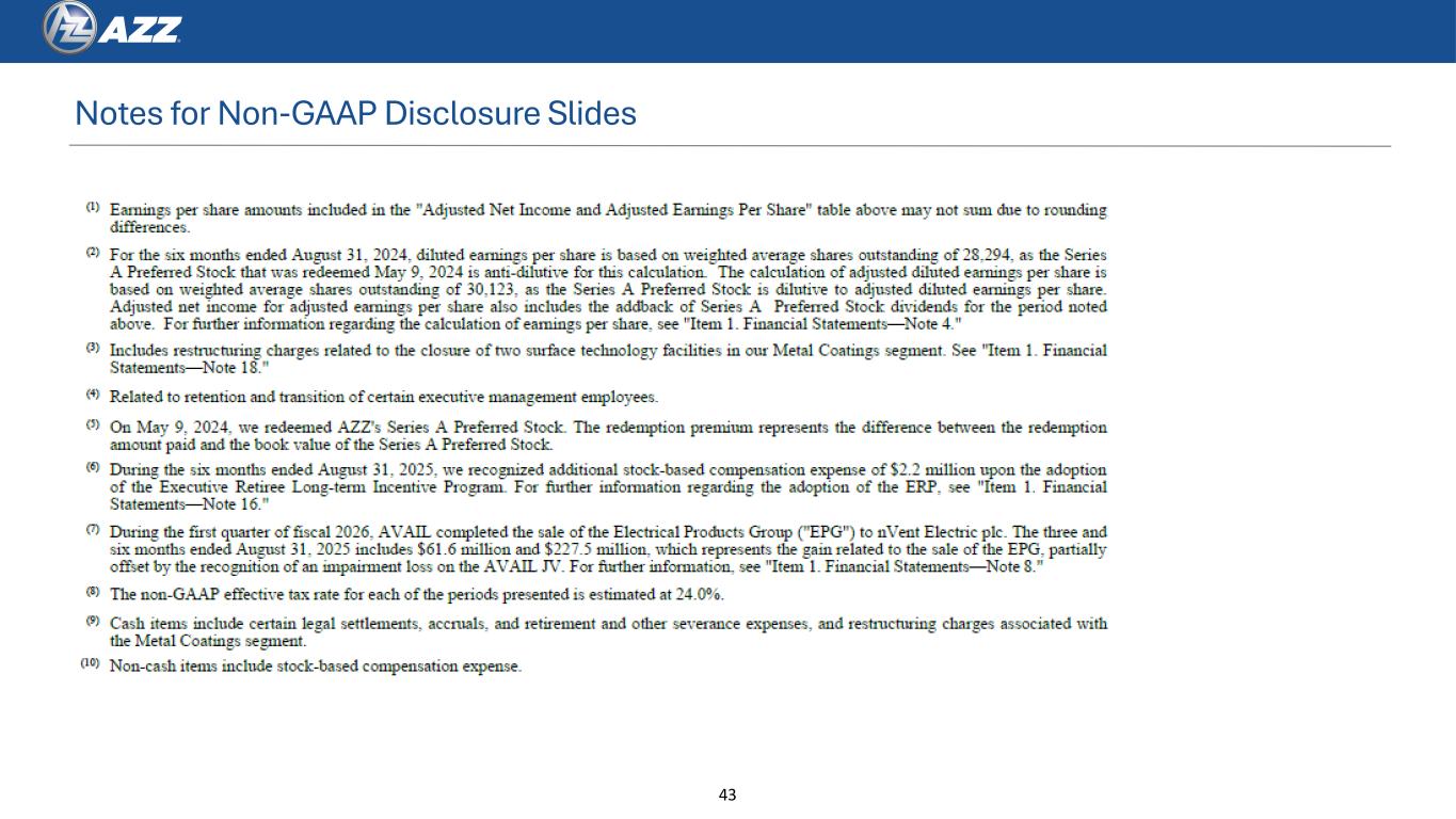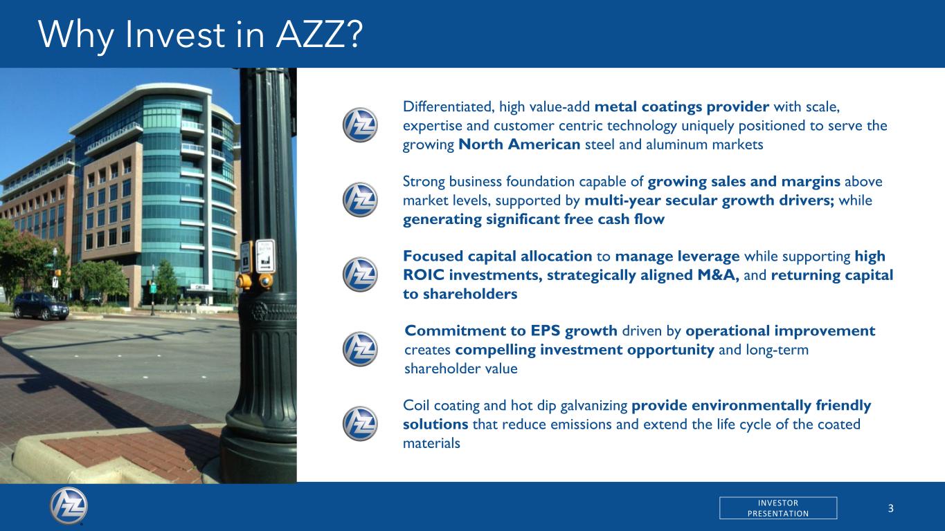 2INVESTOR PRESENTATION Disclaimers Cautionary Statements Regarding Forward Looking Statements — Certain statements herein about our expectations of future events or results constitute forward-looking statements for purposes of the safe harbor provisions of The Private Securities Litigation Reform Act of 1995. You can identify forward-looking statements by terminology such as "may," "could," "should," "expects," "plans," "will," "might," "would," "projects," "currently," "intends," "outlook," "forecasts," "targets," "anticipates," "believes," "estimates," "predicts," "potential," "continue," or the negative of these terms or other comparable terminology. Such forward-looking statements are based on currently available competitive, financial, and economic data and management’s views and assumptions regarding future events. Such forward-looking statements are inherently uncertain, and investors must recognize that actual results may differ from those expressed or implied in the forward-looking statements. Forward-looking statements speak only as of the date they are made and are subject to risks that could cause them to differ materially from actual results. Certain factors could affect the outcome of the matters described herein. This presentation may contain forward-looking statements that involve risks and uncertainties including, but not limited to, changes in customer demand for our manufactured solutions, including demand by the construction markets, the industrial markets, and the metal coatings markets. We could also experience additional increases in labor costs, components and raw materials including zinc and natural gas, which are used in our hot-dip galvanizing process, paint used in our coil coating process; supply-chain vendor delays; customer requested delays of our manufactured solutions; delays in additional acquisition opportunities; an increase in our debt leverage and/or interest rates on our debt, of which a significant portion is tied to variable interest rates; availability of experienced management and employees to implement AZZ’s growth strategy; a downturn in market conditions in any industry relating to the manufactured solutions that we provide; economic volatility, including a prolonged economic downturn or macroeconomic conditions such as inflation or changes in the political stability in the United States and other foreign markets in which we operate; tariffs; acts of war or terrorism inside the United States or abroad; and other changes in economic and financial conditions. AZZ has provided additional information regarding risks associated with the business, including in Part I, Item 1A. Risk Factors, in AZZ's Annual Report on Form 10-K for the fiscal year ended February 28, 2025, and other filings with the SEC, available for viewing on AZZ's website at www.azz.com and on the SEC's website at www.sec.gov. You are urged to consider these factors carefully when evaluating the forward-looking statements herein and are cautioned not to place undue reliance on such forward-looking statements, which are qualified in their entirety by this cautionary statement. These statements are based on information as of the date hereof and AZZ assumes no obligation to update any forward-looking statements, whether as a result of new information, future events, or otherwise. Non-GAAP – Regulation G Disclosures — In addition to reporting financial results in accordance with Generally Accepted Accounting Principles in the United States ("GAAP"), AZZ has provided EBITDA, Adjusted EBITDA, Net Debt, Net Leverage, Free Cash Flow and Free Cash Flow Conversion which are non-GAAP measures, which should be considered supplemental to, not a substitute for, or superior to, the financial measures calculated in accordance with GAAP. Management believes that the presentation of these measures provides investors with a greater transparency comparison of operating results across a broad spectrum of companies, which provides a more complete understanding of AZZ’s financial performance, competitive position and prospects for the future. Management also believes that investors regularly rely on non-GAAP financial measures, such as EBITDA and Adjusted EBITDA, to assess operating performance and that such measures may highlight trends in the Company’s business that may not otherwise be apparent when relying on financial measures calculated in accordance with GAAP. There are a number of limitations related to the use of these non-GAAP financial measures and their nearest GAAP equivalents. For example, AZZ's definitions of non-GAAP financial measures may differ from non-GAAP financial measures used by other companies. For reconciliations to the most directly comparable GAAP measure, see the appendix to this presentation.