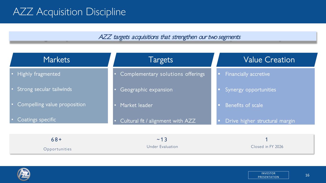 15INVESTOR PRESENTATION Sales($Bn) Adjusted EBITDA Margin (1) TTM Sales for the period ended August 31, 2025 (2) TTM EBITDA inclusive of corporate costs for the period ended August 31, 2025 3 Year Goals 2x GDP Annual Organic Sales Growth Execute Robust pipeline of acquisition targets Ma in t a i n be s t i n c l a s s f i n anc i a l pe r fo rmance >22% Conso l i d a t ed EB ITDA Marg i n >12% ROIC 1 .5x to 2 . 5x l e ve r a ge Current Dislocation in Trading Multiples vs Coatings Peer(3) Where AZZ is Headed $.9 $2.0+ $1.6 FY 2022 TTM(1) FY 2028 E 17% >22% 22% FY 2028 E FY 2022 TTM(2)