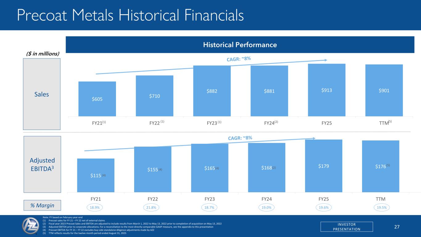 27INVESTOR PRESENTATION Precoat Metals Historical Financials $605 $710 $882 $881 $913 $901 FY21 FY22 FY23 FY24 FY25 TTM(5) $115 $155 $165 $168 $179 $176 18.9% 21.8% 18.7% 19.0% 19.6% 19.5% FY21 FY22 FY23 FY24 FY25 TTM Sales Adjusted EBITDA3 ($ in millions) Historical Performance 13 % Margin Note: FY based on February year-end (1) Precoat sales for FY 21 – FY 22 net of external claims (2) Fiscal year 2023 Precoat Sales and EBITDA are adjusted to include results from March 1, 2022 to May 13, 2022 prior to completion of acquisition on May 13, 2022 (3) Adjusted EBITDA prior to corporate allocations; For a reconciliation to the most directly comparable GAAP measure, see the appendix to this presentation (4) Precoat EBITDA for FY 21 – FY 22 excludes buy-side standalone diligence adjustments made by AZZ (5) TTM reflects results for the twelve-month period ended August 31, 2025 (2) (2) (1) (1) (1) (4) (4) (4) (5)