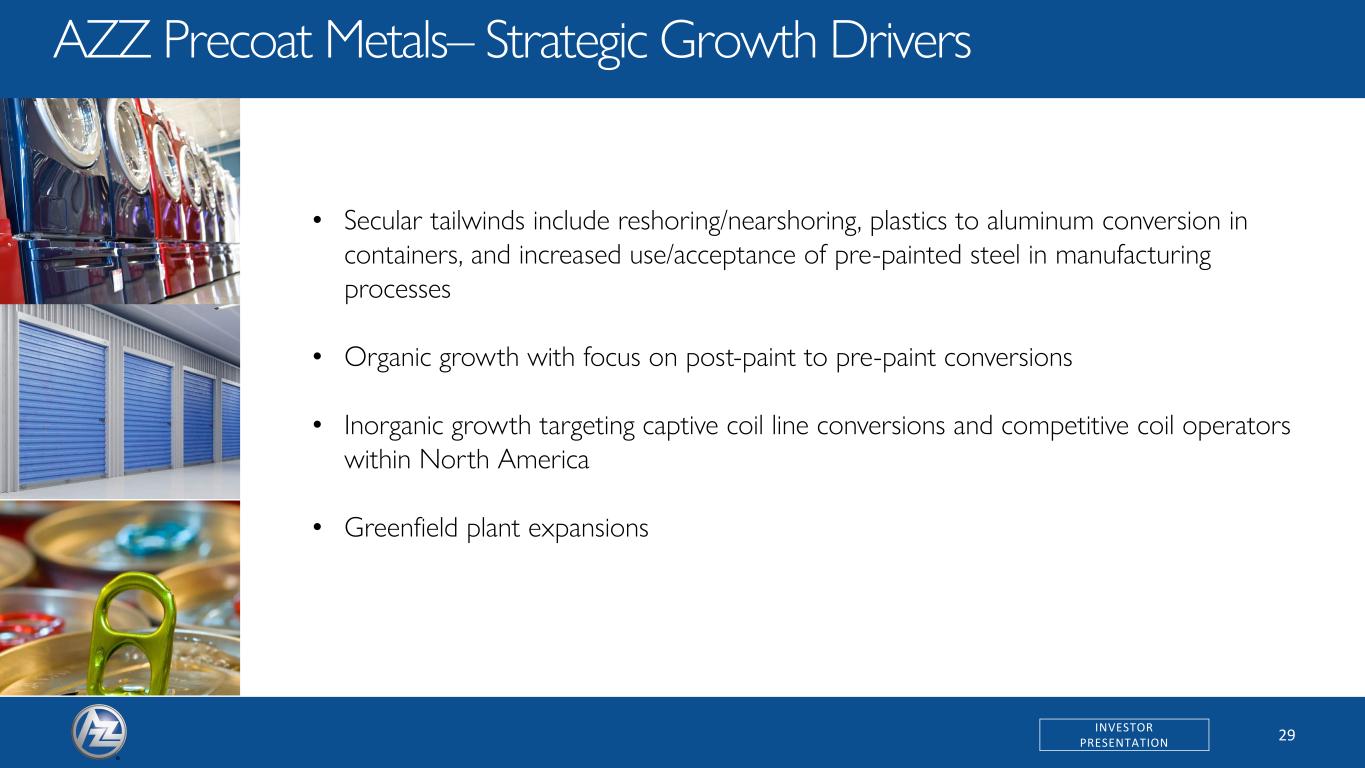 28INVESTOR PRESENTATION Enables AZZ to benefit from secular shift to aluminum cans Run-rate contracted sales of $50+ million exiting FY 2026 at an EBITDA margin above Precoat overall margin ROIC well in excess of cost of capital Long-term contractual customer commitment for 75% of the new capacity Total investment of ~$125 million New aluminum coil coating line in Washington, Missouri Compelling Strategic and Financial Investment Investing in Future Growth Two-year construction project completed Q4 FY25 on-time and on budget; Achieved profitability ahead of management expectations