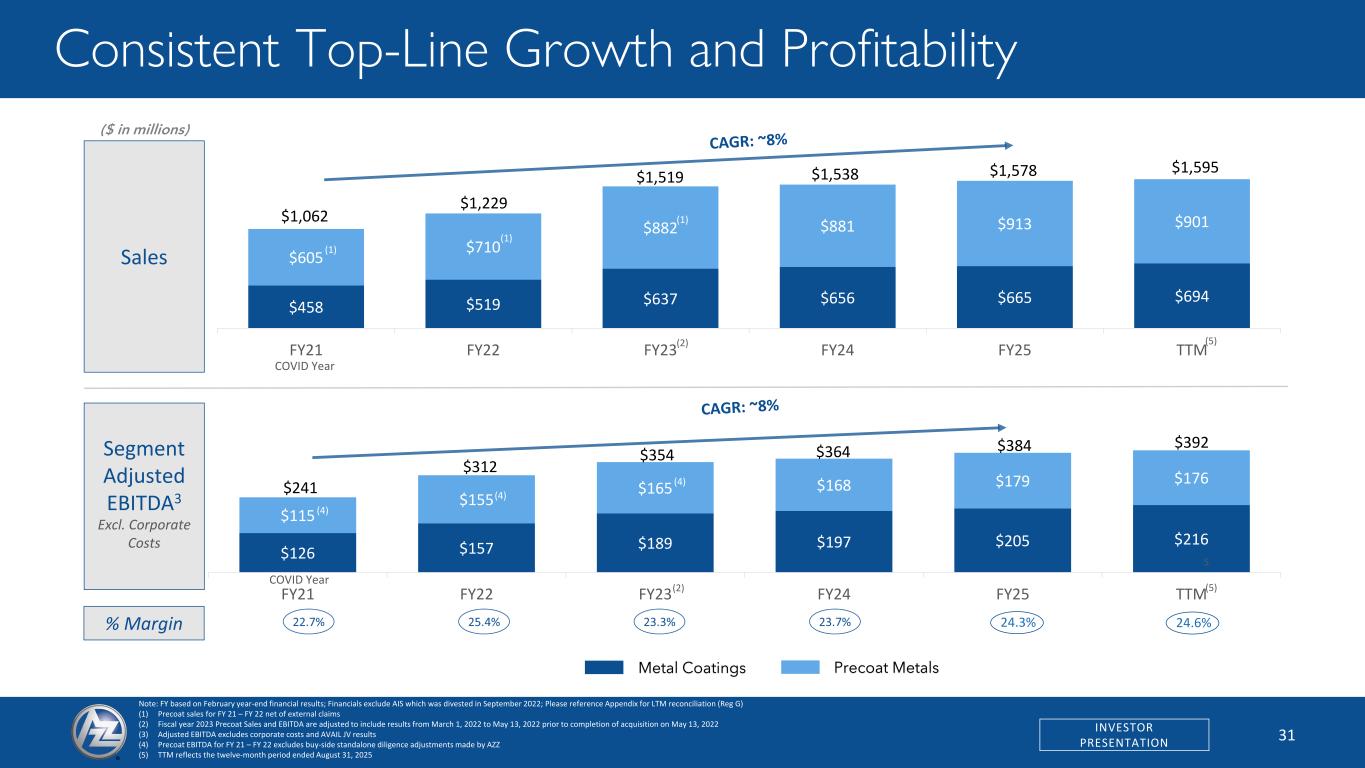 24INVESTOR PRESENTATION Operating Segment Production Route Value-Added Capabilities Market Size and Share(2) Historical Adjusted EBITDA Performance(3) ($ in millions) Precoat Metals Continuous Processing Coil Coating Slitting Embossing Shape Correction Blanking $4.4B ~23% share #1 market position $115 $155 $165 $168 $179 $176 EBITDA FY2021 FY2022 FY2023 FY2024 FY2025 TTM Production Input Steel & Aluminum Coil Sales $900.6 million(1) (1) Sales based on AZZ trailing twelve-month period ended August 31, 2025 (2) Management estimates based on data from the National Coat Coaters Association as of August 31, 2022 (3) For a reconciliation to the most directly comparable GAAP measure, see the appendix to this presentation; Precoat EBITDA FY2020-FY2022 prior to acquisition; Fiscal year 2023 Precoat EBITDA adjusted to include results from March 1, 2022 to May 13, 2022 prior to completion of acquisition on May 13, 2022; TTM for the period ended August 31, 2025 Precoat Metals – Summary