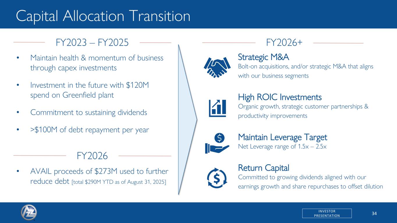 34INVESTOR PRESENTATION Capital Allocation Transition 9 Return Capital Committed to growing dividends aligned with our earnings growth and share repurchases to offset dilution Maintain Leverage Target Net Leverage range of 1.5x – 2.5x High ROIC Investments Organic growth, strategic customer partnerships & productivity improvements Strategic M&A Bolt-on acquisitions, and/or strategic M&A that aligns with our business segments • Maintain health & momentum of business through capex investments • Investment in the future with $120M spend on Greenfield plant • Commitment to sustaining dividends • >$100M of debt repayment per year FY2023 – FY2025 FY2026+ FY2026 • AVAIL proceeds of $273M used to further reduce debt [total $290M YTD as of August 31, 2025]