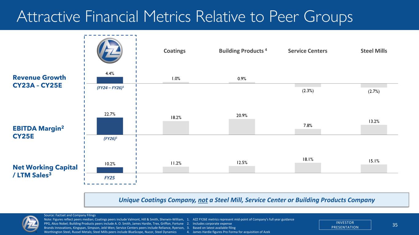 35INVESTOR PRESENTATION Attractive Financial Metrics Relative to Peer Groups Source: Factset and Company Filings Note: Figures reflect peers median; Coatings peers include Valmont, Hill & Smith, Sherwin-William, PPG, Akzo Nobel; Building Products peers include A. O. Smith, James Hardie, Trex, Griffon, Fortune Brands Innovations, Kingspan, Simpson, Jeld-Wen; Service Centers peers include Reliance, Ryerson, Worthington Steel, Russel Metals; Steel Mills peers include BlueScope, Nucor, Steel Dynamics 1. AZZ FY26E metrics represent mid-point of Company’s full year guidance 2. Includes corporate expense 3. Based on latest available filing 4. James Hardie figures Pro Forma for acquisition of Azek Revenue Growth CY23A – CY25E EBITDA Margin2 CY25E Net Working Capital / LTM Sales3 Unique Coatings Company, not a Steel Mill, Service Center or Building Products Company FY25