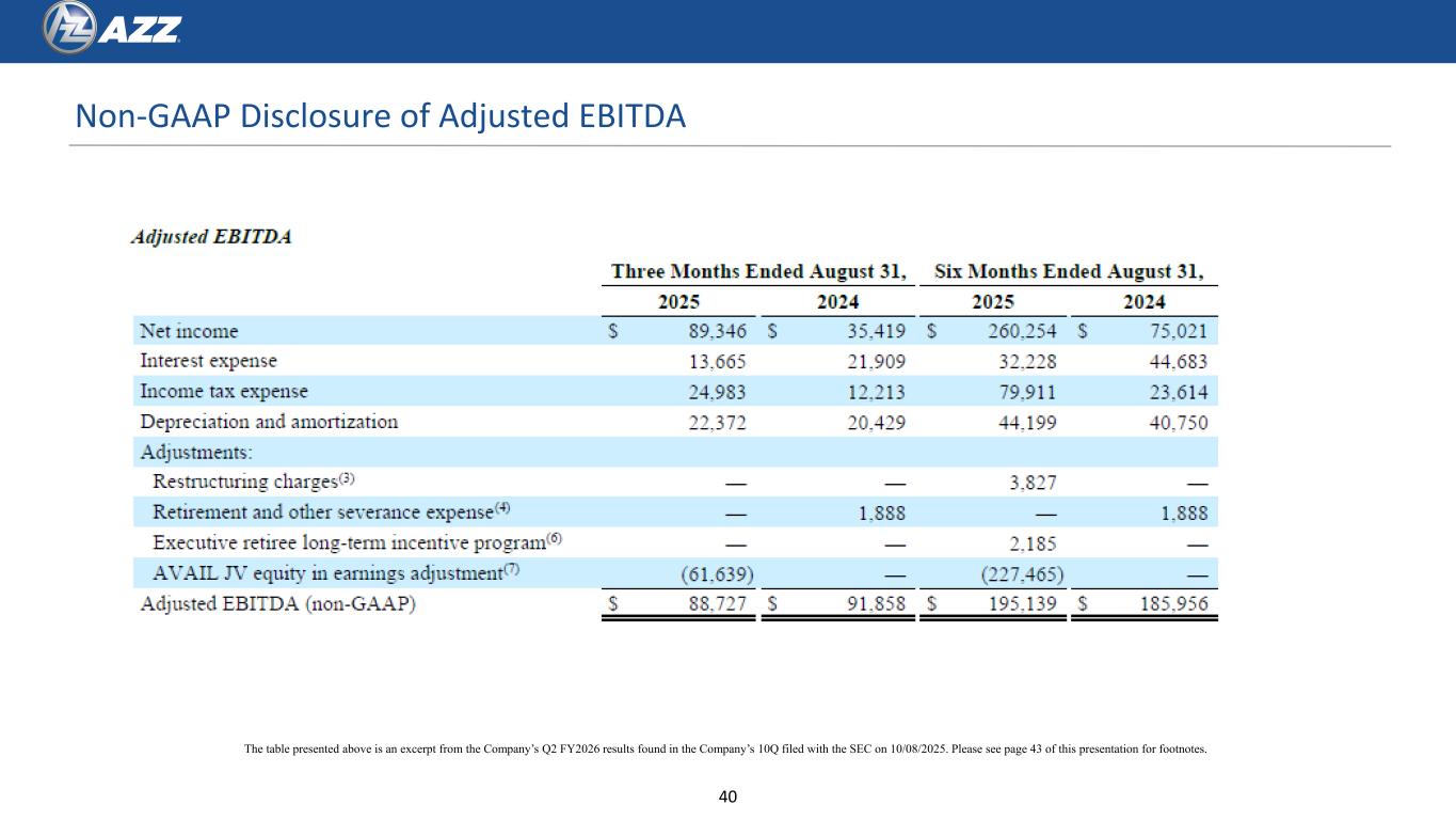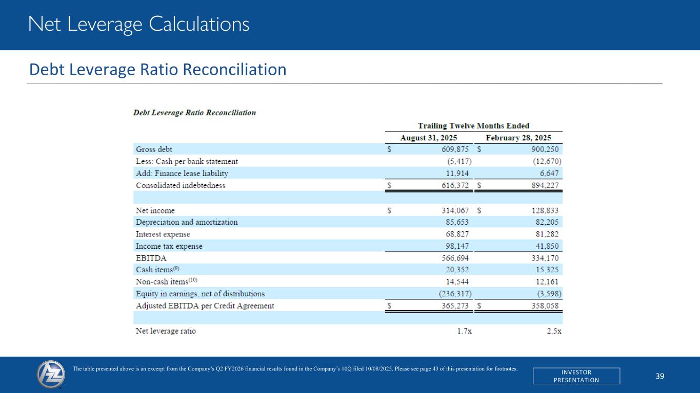 39INVESTOR PRESENTATION Net Leverage Calculations The table presented above is an excerpt from the Company’s Q2 FY2026 financial results found in the Company’s 10Q filed 10/08/2025. Please see page 43 of this presentation for footnotes. Debt Leverage Ratio Reconciliation