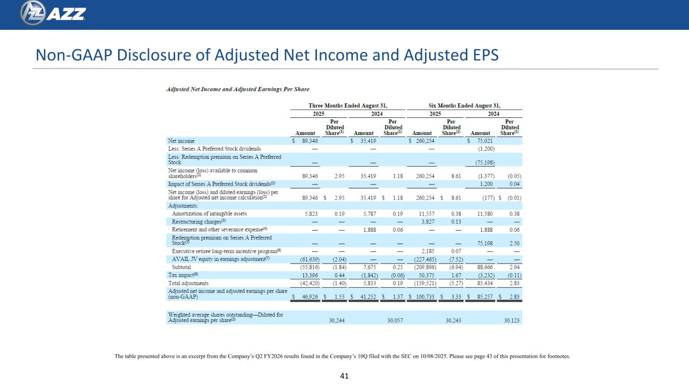 Non-GAAP Disclosure of Adjusted EBITDA 40 The table presented above is an excerpt from the Company’s Q2 FY2026 results found in the Company’s 10Q filed with the SEC on 10/08/2025. Please see page 43 of this presentation for footnotes.