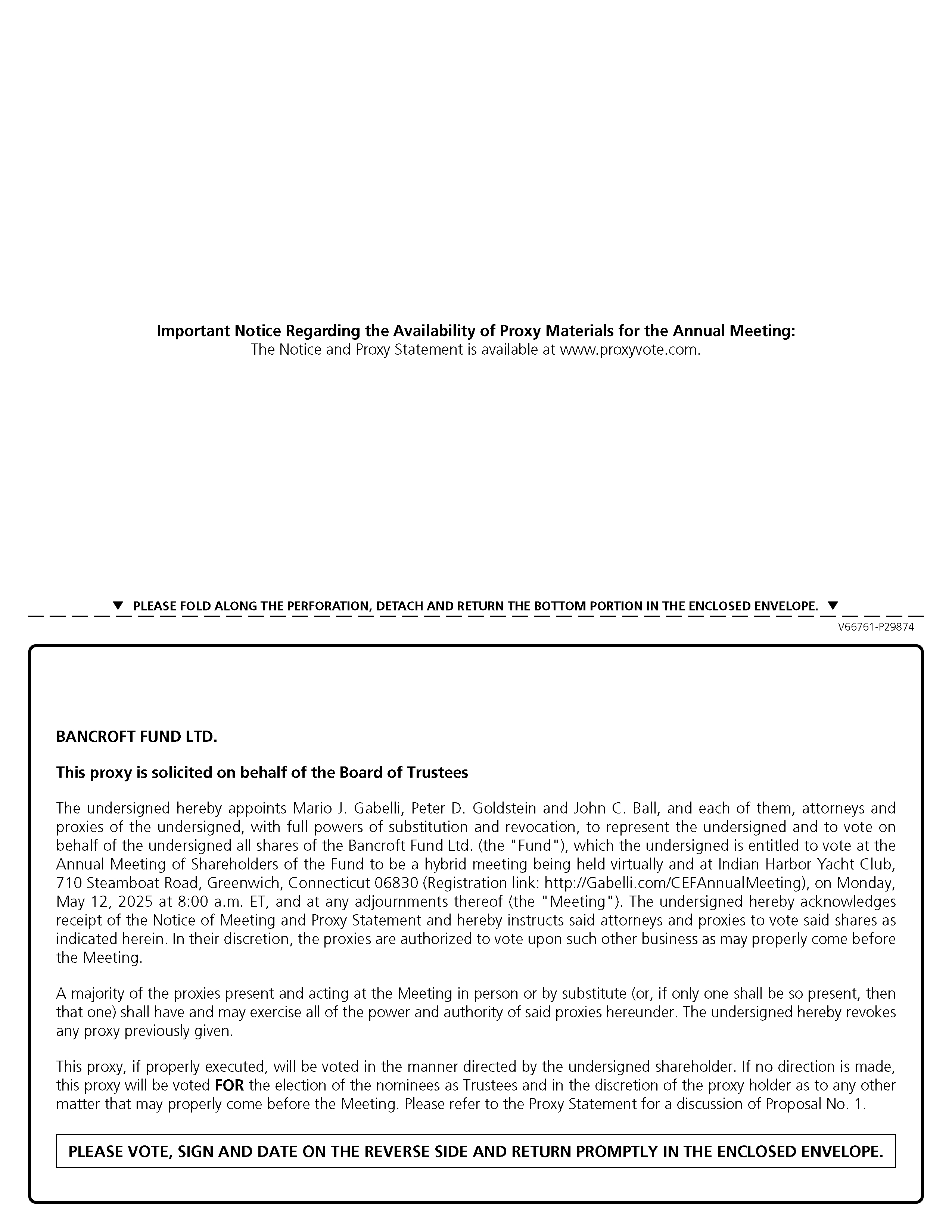 This Proxy Statement is furnished in connection with the solicitation of proxies by the Board of Trustees (the “Board,” the members of which are referred to as “Trustees”) of the Bancroft Fund Ltd., a Delaware statutory trust (the “Fund”), for use at the Annual Meeting of Shareholders of the Fund to be held on Monday, May 12, 2025, at 8:00 a.m., ET, at Indian Harbor Yacht Club, 710 Steamboat Road, Greenwich, Connecticut, 06830 and virtually by Internet webcast (the “Meeting”), and at any adjournments or postponements thereof. A Notice of Internet Availability of Proxy Materials will first be mailed to shareholders on or about April 2, 2025.