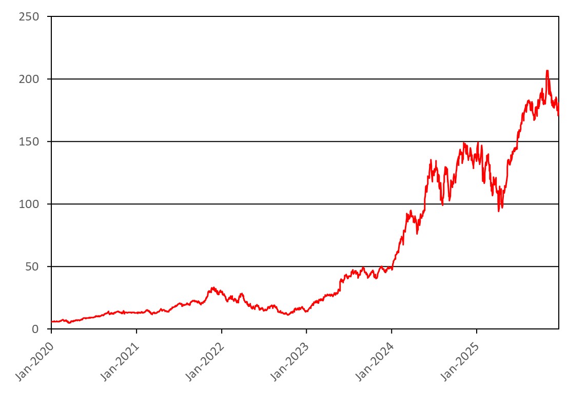 We obtained the information regarding the historical performance of the reference asset in the graph below from Bloomberg, without independent review or verification. The graph below illustrates the performance of the reference asset from January 1, 2020 through December 19, 2025. The closing price of the reference asset on December 19, 2025 was $180.99.