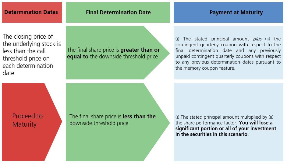If the closing price of the underlying stock on any determination date other than the final determination date is greater than or equal to the call threshold price, the securities will be automatically redeemed for an amount per security equal to the early redemption payment on the first contingent coupon payment date immediately following the related determination date. No further payments will be made on the securities once they have been redeemed. |