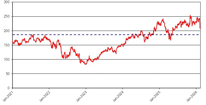 The closing price of the underlying stock on February 10, 2026 was $206.96. The graph below sets forth the closing prices of the underlying stock for each day from January 1, 2021 through February 10, 2026. The dotted line represents the trigger level of $186.264, which is equal to 90.00% of the initial share price. We obtained the information in the graph below from Bloomberg Professional® service (“Bloomberg”), without independent verification. The closing prices may be adjusted by Bloomberg for corporate actions such as stock splits, public offerings, mergers and acquisitions, spin-offs, delistings and bankruptcy. BNS has not undertaken an independent review or due diligence of any publicly available information obtained from Bloomberg. The historical performance of the underlying stock should not be taken as an indication of its future performance, and no assurance can be given as to the closing price of the underlying stock at any time, including the valuation date.