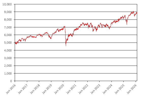 The graph below illustrates the performance of TPX from January 1, 2016 through February 10, 2026. The closing level of TPX on February 10, 2026 was 3,855.28.
