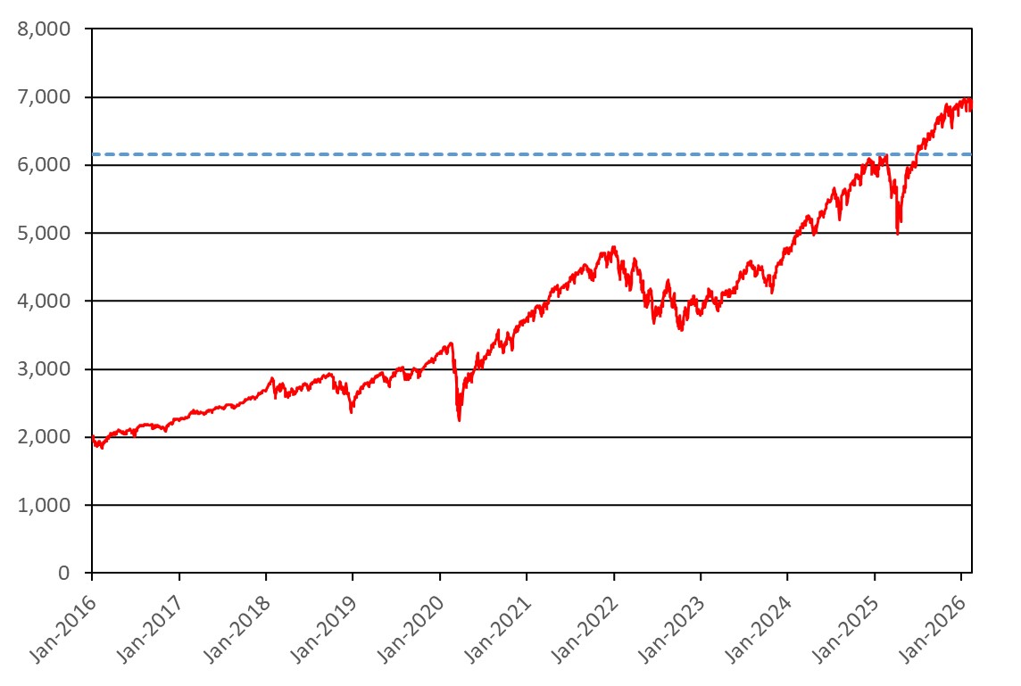 The graph below illustrates the performance of the underlying asset for the period from January 1, 2016 through February 12, 2026, based on the daily closing levels as reported by Bloomberg, without independent verification. The closing level of the underlying asset on February 12, 2026 was 6,832.76 (the “hypothetical initial level”). The dotted line represents the hypothetical downside threshold of 6,149.48, which is equal to 90.00% of the hypothetical initial level. The actual initial level and downside threshold will be determined on the trade date. Past performance of the underlying asset is not indicative of the future performance of the underlying asset during the term of the Securities.