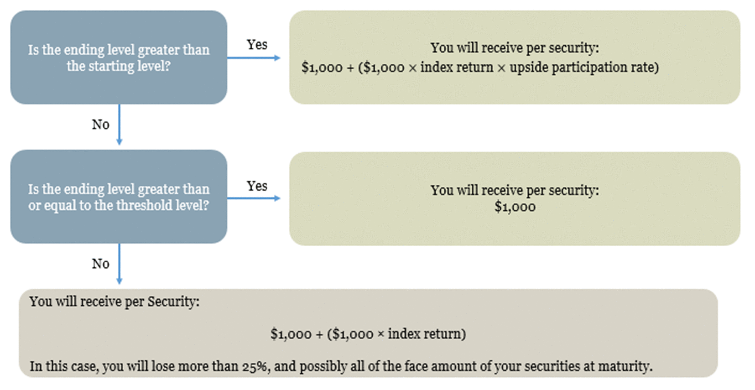 • if the ending level is greater than the starting level: $1,000 + ($1,000 × index return × upside participation rate) • if the ending level is less than or equal to the starting level, but greater than or equal to the threshold level: $1,000; or • if the ending level is less than the threshold level: $1,000 + ($1,000 ×index return) |