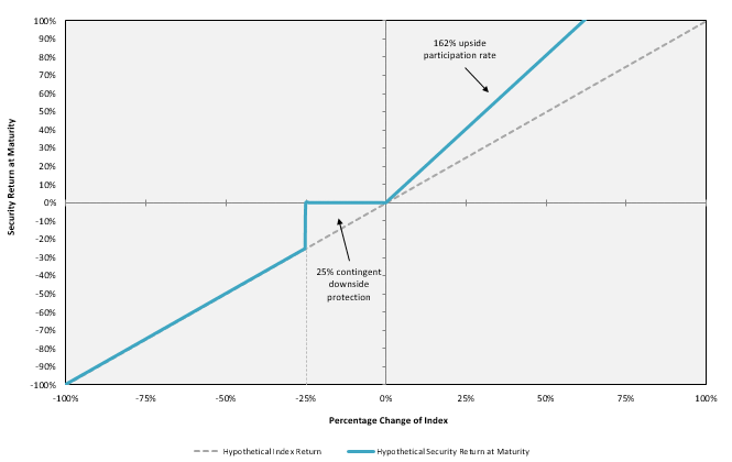 Because the hypothetical ending level is greater than the hypothetical starting level, the maturity payment amount per security would be equal to the face amount of $1,000 plus a positive return equal to: