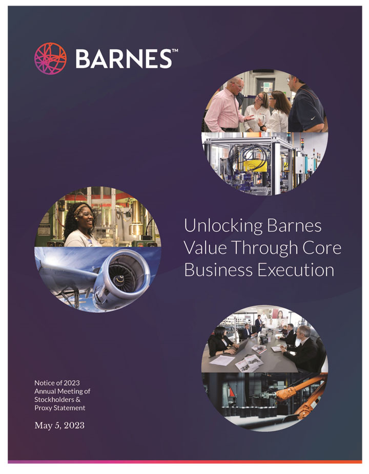 You are invited to attend the 2023 Annual Meeting of Stockholders of Barnes Group Inc. (“Barnes” or the “Company”) to be held on May 5, 2023 at 11:00 A.M. Eastern Time (E.T.) at the DoubleTree by Hilton, 42 Century Drive, Bristol, CT 06010. The 2023 Annual Meeting will be a hybrid meeting*. This means that you may attend the 2023 Annual Meeting either in person, or virtually via a live audio webcast by visiting www.virtualshareholdermeeting.com/B2023. Instructions on how to attend and participate virtually in the live audio webcast of the 2023 Annual Meeting and how to vote your shares virtually while attending this live audio webcast are detailed on the following page and posted on www.virtualshareholdermeeting.com/B2023.