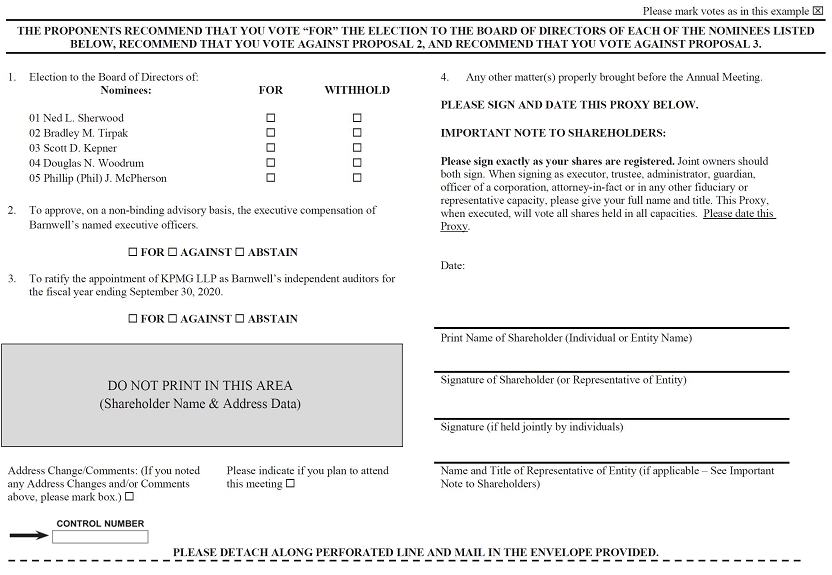 Please mark votes as in this example THE PROPONENTS RECOMMEND THAT YOU VOTE “FOR” THE ELECTION TO THE BOARD OF DIRECTORS OF EACH OF THE NOMINEES LISTED BELOW, RECOMMEND THAT YOU VOTE AGAINST PROPOSAL 2, AND RECOMMEND THAT YOU VOTE AGAINST PROPOSAL 3. 1.Election to the Board of Directors of:4.Any other matter(s) properly brought before the Annual Meeting.Nominees:FORWITHHOLDPLEASE SIGN AND DATE THIS PROXY BELOW.01 Ned L. Sherwood02 Bradley M. TirpakIMPORTANT NOTE TO SHAREHOLDERS:03 Scott D. KepnerPlease sign exactly as your shares are registered. Joint owners should both sign. When signing as executor, trustee, administrator, guardian, officer of a corporation, attorney-in-fact or in any other fiduciary or representative capacity, please give your full name and title. This Proxy, when executed, will vote all shares held in all capacities. Please date this Proxy.04 Douglas N. Woodrum05 Phillip (Phil) J. McPherson2.To approve, on a non-binding advisory basis, the executive compensation of Barnwell’s named executive officers.FOR AGAINST ABSTAINDate:3.To ratify the appointment of KPMG LLP as Barnwell’s independent auditors for the fiscal year ending September 30, 2020.FOR AGAINST ABSTAINPrint Name of Shareholder (Individual or Entity Name) DO NOT PRINT IN THIS AREA (Shareholder Name & Address Data)Signature of Shareholder (or Representative of Entity)Signature (if held jointly by individuals)Address Change/Comments: (If you noted any Address Changes and/or Comments above, please mark box.) Please indicate if you plan to attend this meeting Name and Title of Representative of Entity (if applicable – See Important Note to Shareholders)PLEASE DETACH ALONG PERFORATED LINE AND MAIL IN THE ENVELOPE PROVIDED.