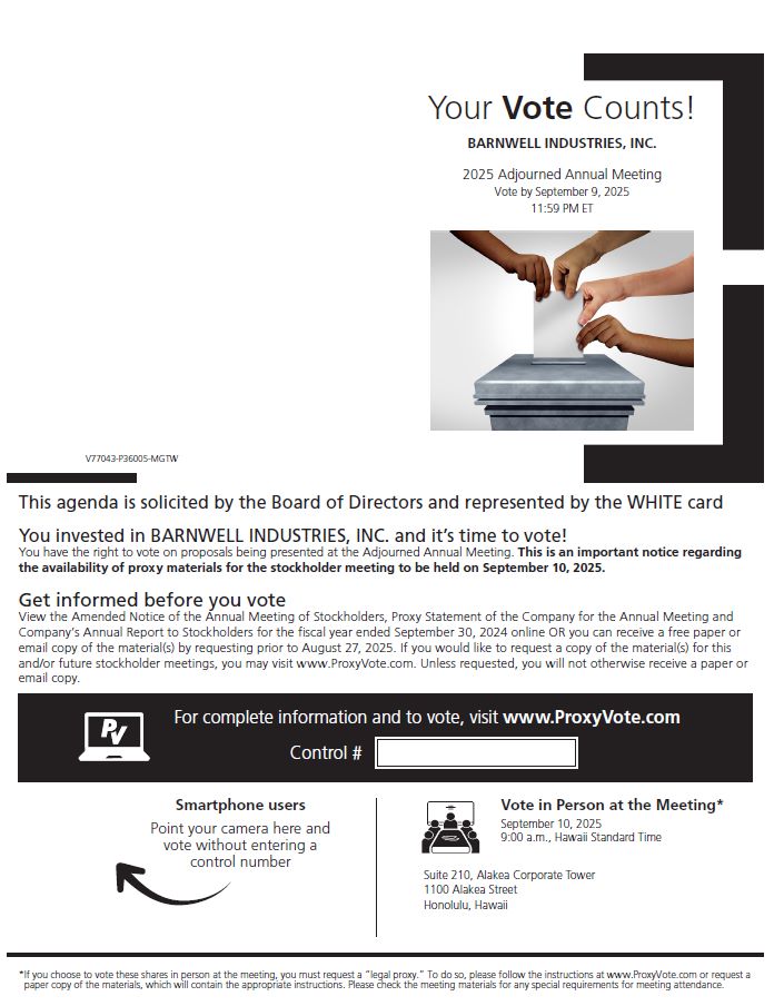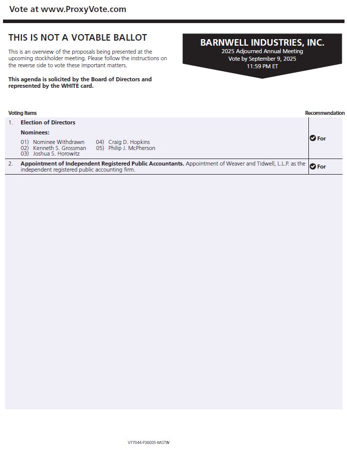 Your Vote Counts! BARNWELL INDUSTRIES, INC. 2025 Adjourned Annual Meeting Vote by September 9, 2025 11:59 PM ET V77043-P36005-MGTW Your Vote Counts!BARNWELL INDUSTRIES, INC.2025 Adjourned Annual MeetingVote by September 9, 202511:59 PM ETV77043-P36005-MGTWThis agenda is solicited by the Board of Directors and