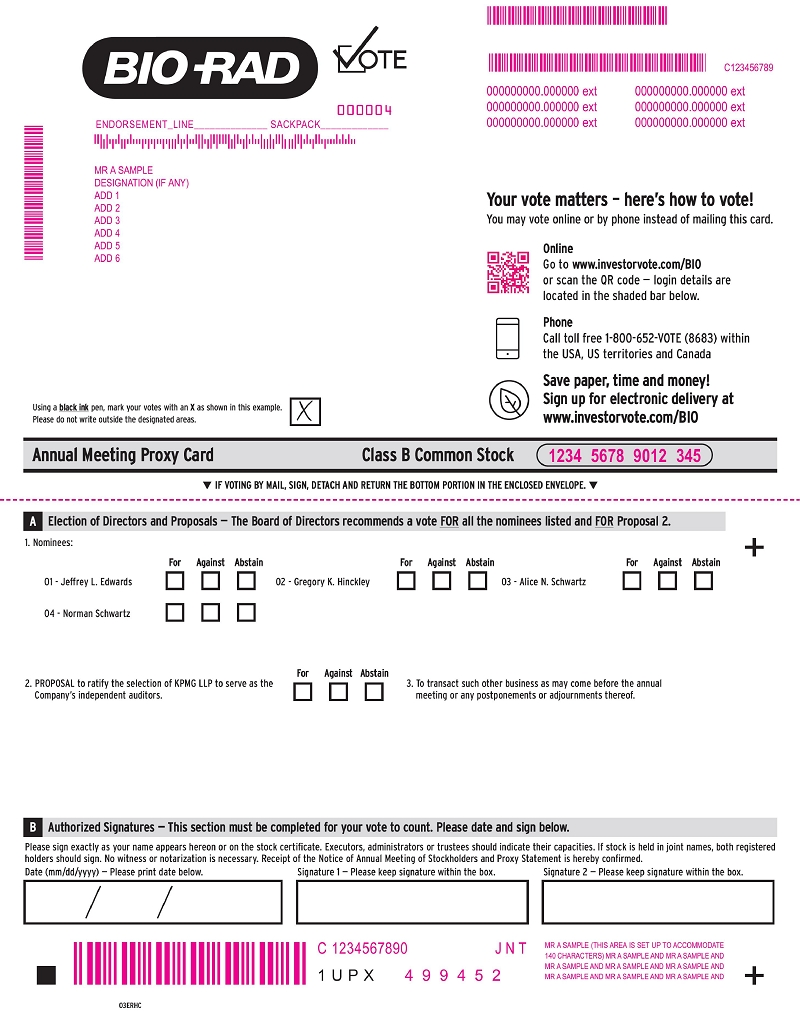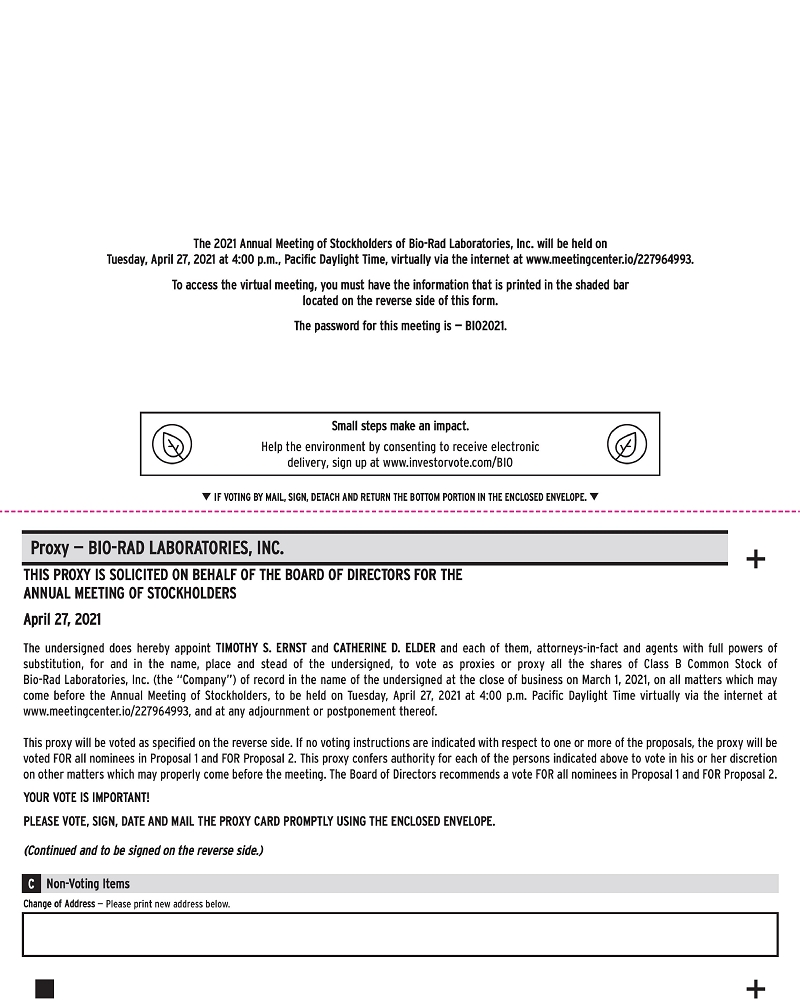 The annual meeting of the stockholders of Bio-Rad Laboratories, Inc. will be held on Tuesday, April 27, 2021 at 4:00 p.m., Pacific Daylight Time. In light of the COVID-19 pandemic and governmental restrictions on in-person gatherings, and in the best interests of public health and the health and safety of our stockholders, employees, community and Board of Directors, we are holding a virtual-only meeting. Stockholders can attend the meeting via the Internet at www.meetingcenter.io/227964993 by following the instructions that accompanied your proxy materials. The password for the meeting is BIO2021. The annual meeting will be held to consider and vote on: