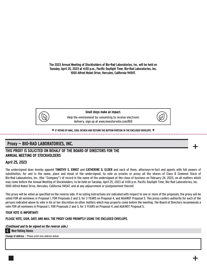 Stockholders of record on February 24, 2023 may obtain copies without charge of our Annual Report on Form 10-K (excluding exhibits) filed with the Securities and Exchange Commission by writing to Attention: Corporate Secretary, Bio-Rad Laboratories, Inc., 1000 Alfred Nobel Drive, Hercules, California 94547.