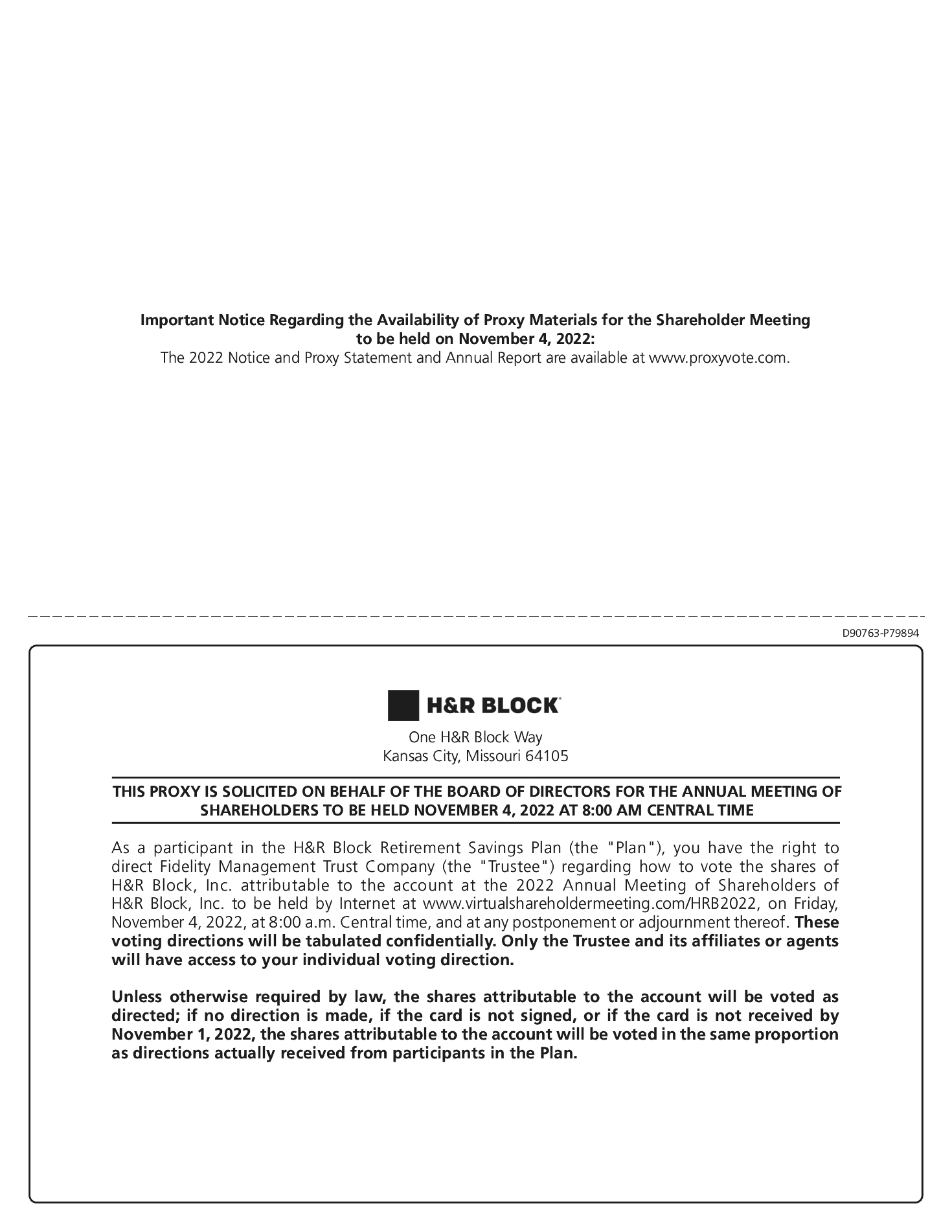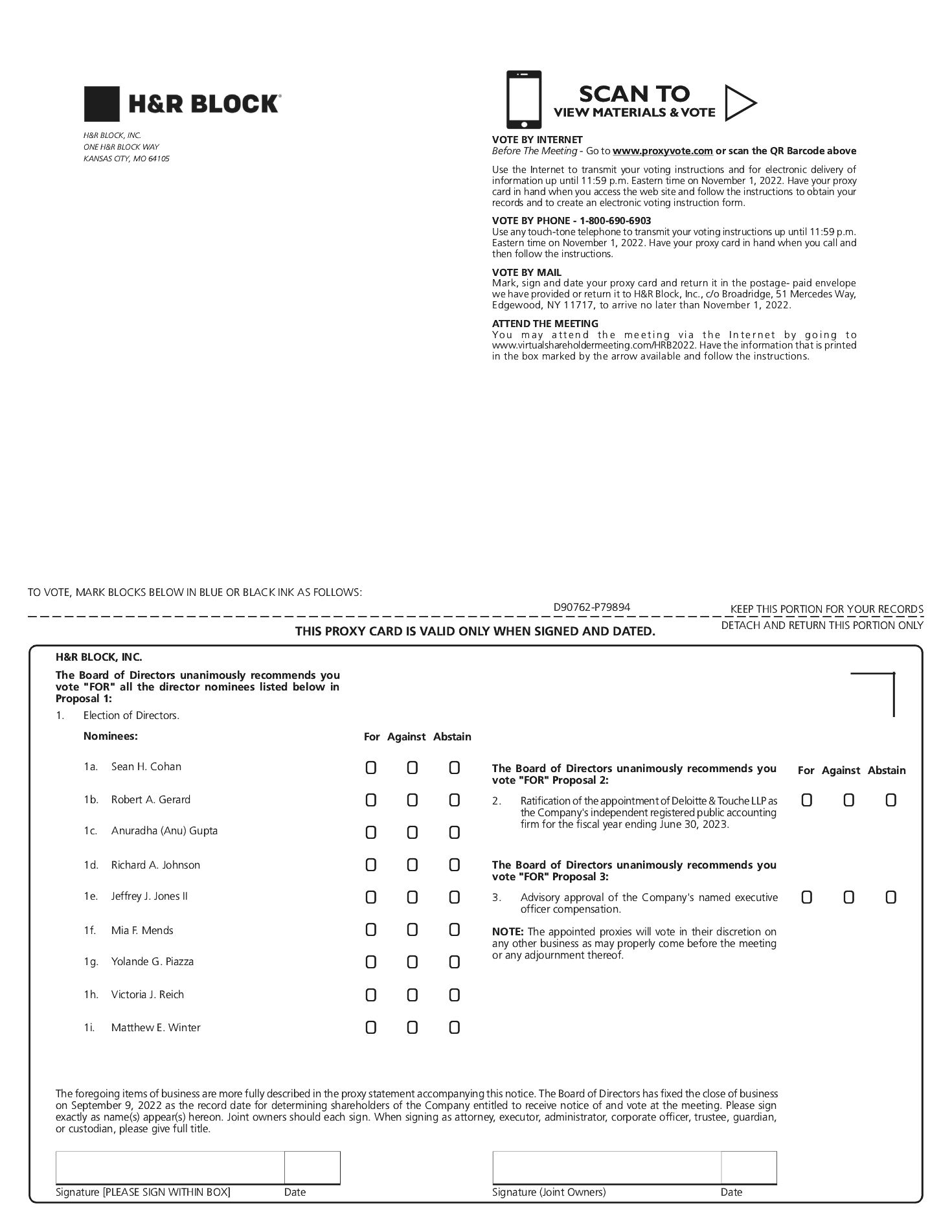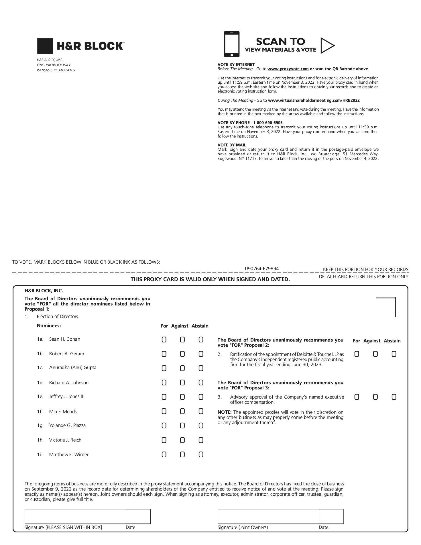 After your initial vote, you may revoke your proxy and change your vote (i) any time prior to the voting deadline via the internet or by telephone (only your latest internet or telephone proxy submitted prior to the voting deadline for the Annual Meeting will be counted), (ii) by signing and returning a new proxy card with a later date prior to the Annual Meeting, or (iii) by attending the Annual Meeting and voting at www.virtualshareholdermeeting.com/HRB2022. However, your attendance at the Annual Meeting will not automatically revoke your proxy unless you vote again at the Annual Meeting or specifically request in writing that your prior proxy be revoked. If your shares are held in street name by a broker, bank, or other nominee, you must contact that nominee to change your vote.