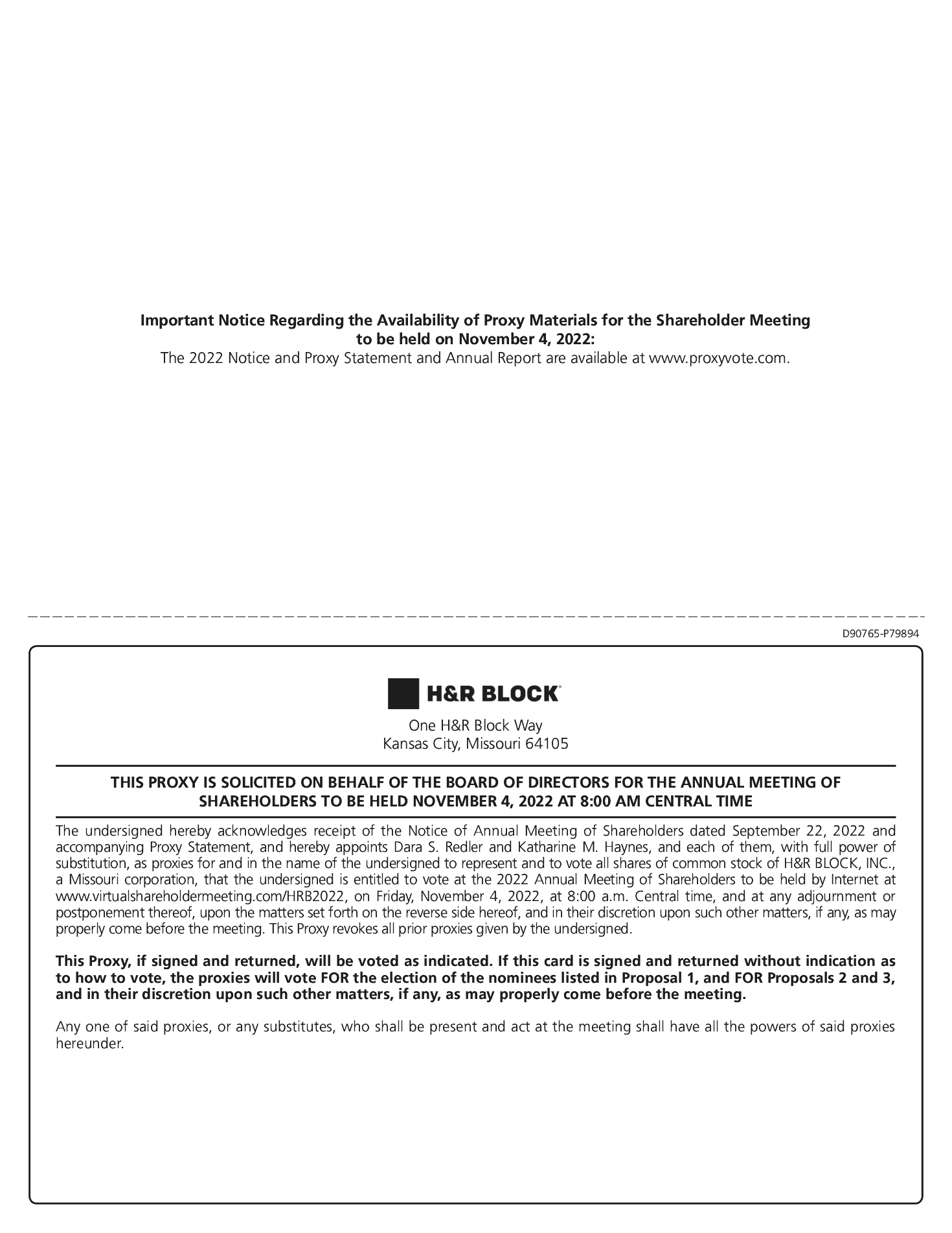 Shareholders at the close of business on the record date may examine a list of all shareholders as of the record date for ten days preceding the meeting, at our offices at One H&R Block Way, Kansas City, Missouri 64105, and electronically during the meeting at www.virtualshareholdermeeting.com/HRB2022 when you enter the Control Number included on your proxy card, voting instruction card or Notice you received.