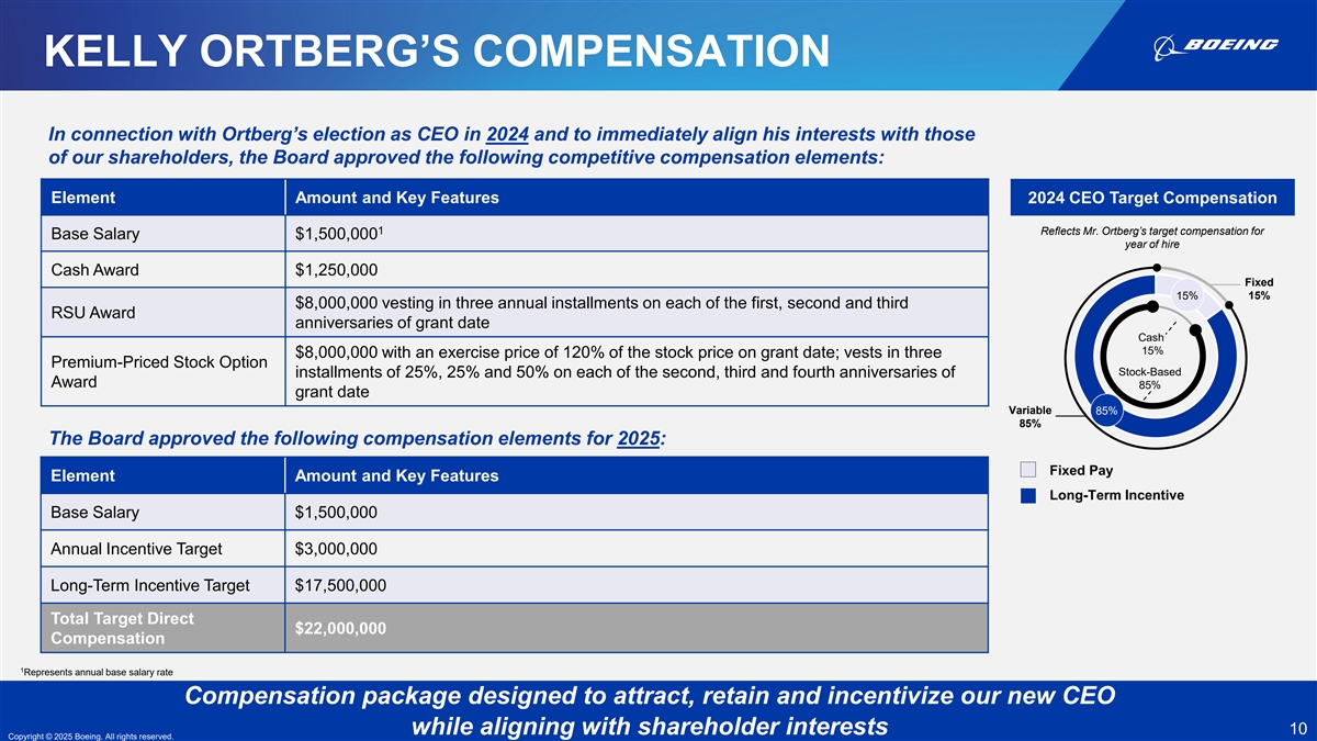 2024 OUTCOMES ALIGNED WITH PERFORMANCE Annual Incentive Long-Term Incentive 2022-2024 Long-Term Incentive Program Outcomes 2024 Annual Incentive Scores 50% 50% Premium-Priced Stock Options Restricted Stock Units Commercial Airplanes 0% Defense, Space & Security 0% $261 $0 $344 $217 $186 Exercise price Exercisable Stock price to Grant price Vesting date Global Services 56% (120% of stock value on reach for PPSOs price price on date vesting date to deliver target (2/18/2025) Enterprise of grant) (2/16/2025) value 19% (average of the three business units) Mr. Calhoun’s annual incentive payout for 2024 $0 of LTI target value realized upon vesting 43% Assumes zero exercisable value for vested underwater PPSOs Average NEO payout was 14% of target Note: Mr. Ortberg, who joined the Company in August 2024 did not participate in our 2024 annual incentive plan or long-term incentive program. Slide reflects outcomes for all other NEOs Payouts tied directly to performance 9 Copyright © 2025 Boeing. All rights reserved.