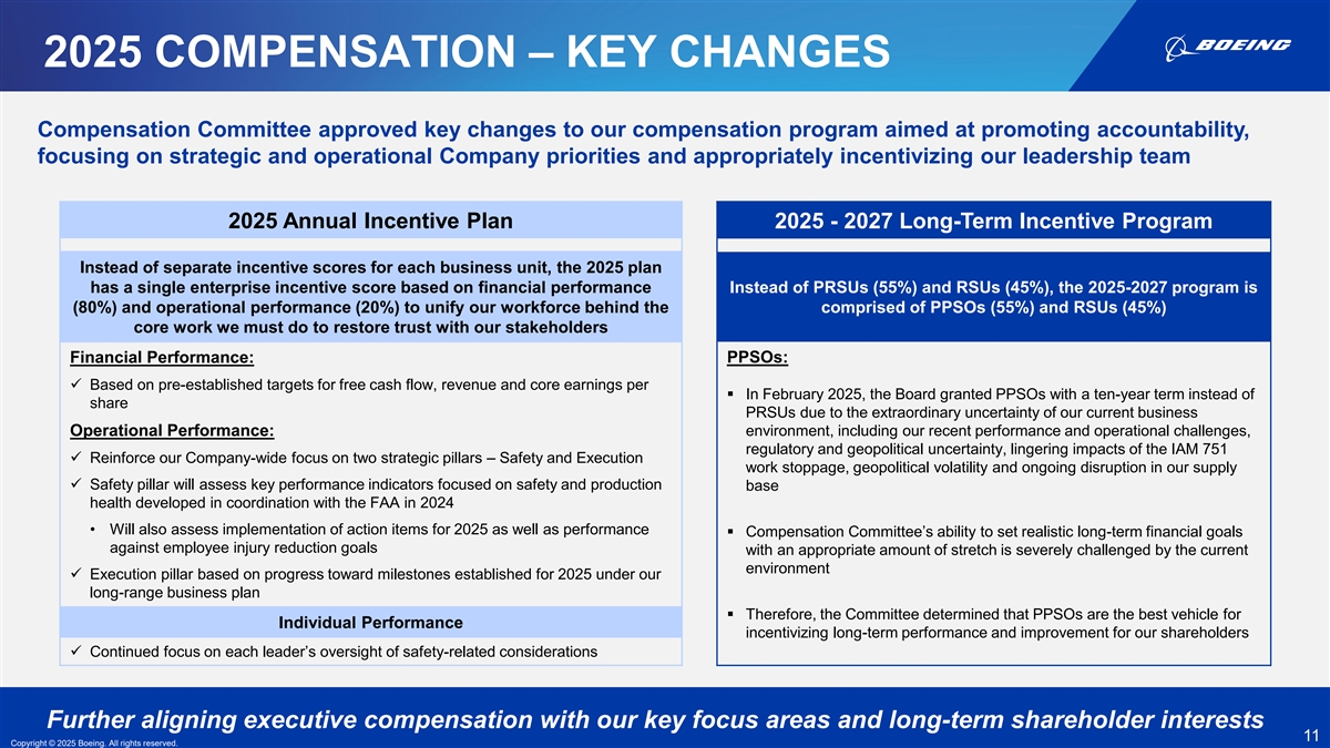 KELLY ORTBERG’S COMPENSATION In connection with Ortberg’s election as CEO in 2024 and to immediately align his interests with those of our shareholders, the Board approved the following competitive compensation elements: Element Amount and Key Features 2024 CEO Target Compensation 1 Reflects Mr. Ortberg’s target compensation for Base Salary $1,500,000 year of hire Cash Award $1,250,000 Fixed 15% 15% $8,000,000 vesting in three annual installments on each of the first, second and third RSU Award anniversaries of grant date Cash 15% $8,000,000 with an exercise price of 120% of the stock price on grant date; vests in three Premium-Priced Stock Option Stock-Based installments of 25%, 25% and 50% on each of the second, third and fourth anniversaries of Award 85% grant date Variable 85% 85% The Board approved the following compensation elements for 2025: Fixed Pay Element Amount and Key Features Long-Term Incentive Base Salary $1,500,000 Annual Incentive Target $3,000,000 Long-Term Incentive Target $17,500,000 Total Target Direct $22,000,000 Compensation 1 Represents annual base salary rate Compensation package designed to attract, retain and incentivize our new CEO 10 while aligning with shareholder interests Copyright © 2025 Boeing. All rights reserved.