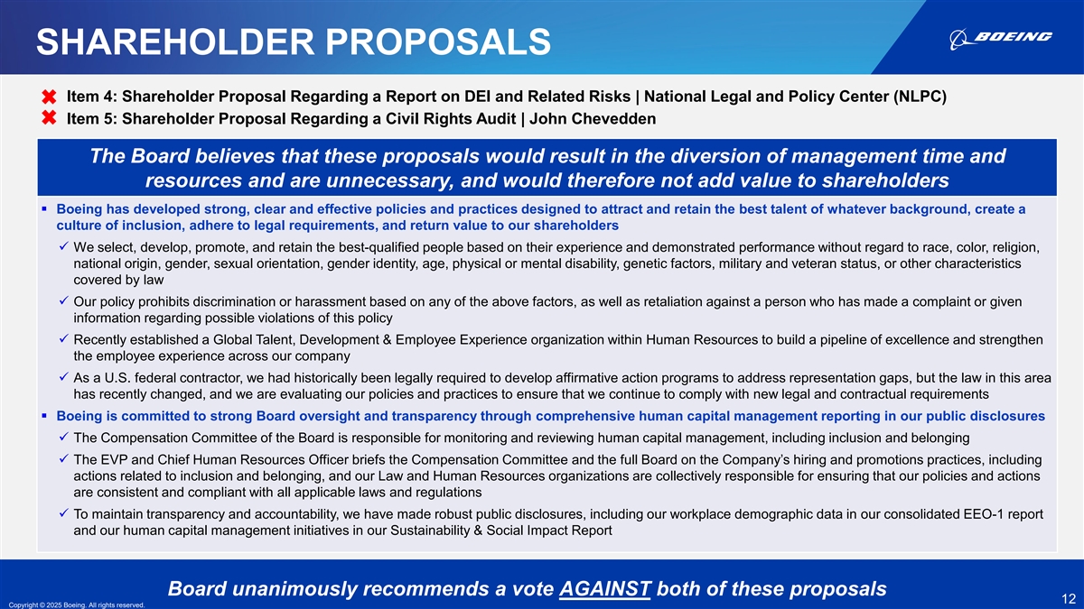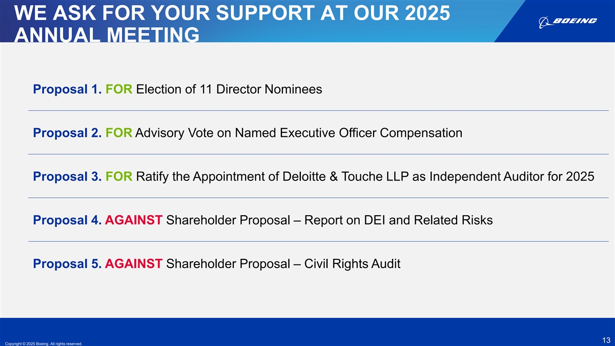 SHAREHOLDER PROPOSALS Item 4: Shareholder Proposal Regarding a Report on DEI and Related Risks | National Legal and Policy Center (NLPC) Item 5: Shareholder Proposal Regarding a Civil Rights Audit | John Chevedden The Board believes that these proposals would result in the diversion of management time and resources and are unnecessary, and would therefore not add value to shareholders § Boeing has developed strong, clear and effective policies and practices designed to attract and retain the best talent of whatever background, create a culture of inclusion, adhere to legal requirements, and return value to our shareholders ü We select, develop, promote, and retain the best-qualified people based on their experience and demonstrated performance without regard to race, color, religion, national origin, gender, sexual orientation, gender identity, age, physical or mental disability, genetic factors, military and veteran status, or other characteristics covered by law ü Our policy prohibits discrimination or harassment based on any of the above factors, as well as retaliation against a person who has made a complaint or given information regarding possible violations of this policy ü Recently established a Global Talent, Development & Employee Experience organization within Human Resources to build a pipeline of excellence and strengthen the employee experience across our company ü As a U.S. federal contractor, we had historically been legally required to develop affirmative action programs to address representation gaps, but the law in this area has recently changed, and we are evaluating our policies and practices to ensure that we continue to comply with new legal and contractual requirements § Boeing is committed to strong Board oversight and transparency through comprehensive human capital management reporting in our public disclosures ü The Compensation Committee of the Board is responsible for monitoring and reviewing human capital management, including inclusion and belonging ü The EVP and Chief Human Resources Officer briefs the Compensation Committee and the full Board on the Company’s hiring and promotions practices, including actions related to inclusion and belonging, and our Law and Human Resources organizations are collectively responsible for ensuring that our policies and actions are consistent and compliant with all applicable laws and regulations ü To maintain transparency and accountability, we have made robust public disclosures, including our workplace demographic data in our consolidated EEO-1 report and our human capital management initiatives in our Sustainability & Social Impact Report Board unanimously recommends a vote AGAINST both of these proposals 12 Copyright © 2025 Boeing. All rights reserved.