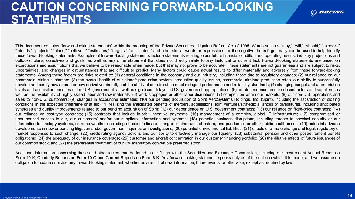 CAUTION CONCERNING FORWARD-LOOKING STATEMENTS This document contains “forward-looking statements” within the meaning of the Private Securities Litigation Reform Act of 1995. Words such as “may,” “will,” “should,” “expects,” “intends,” “projects,” “plans,” “believes,” “estimates,” “targets,” “anticipates,” and other similar words or expressions, or the negative thereof, generally can be used to help identify these forward-looking statements. Examples of forward-looking statements include statements relating to our future financial condition and operating results, industry projections and outlooks, plans, objectives and goals, as well as any other statement that does not directly relate to any historical or current fact. Forward-looking statements are based on expectations and assumptions that we believe to be reasonable when made, but that may not prove to be accurate. These statements are not guarantees and are subject to risks, uncertainties, and changes in circumstances that are difficult to predict. Many factors could cause actual results to differ materially and adversely from these forward-looking statements. Among these factors are risks related to: (1) general conditions in the economy and our industry, including those due to regulatory changes; (2) our reliance on our commercial airline customers; (3) the overall health of our aircraft production system, production quality issues, commercial airplane production rates, our ability to successfully develop and certify new aircraft or new derivative aircraft, and the ability of our aircraft to meet stringent performance and reliability standards; (4) changing budget and appropriation levels and acquisition priorities of the U.S. government, as well as significant delays in U.S. government appropriations; (5) our dependence on our subcontractors and suppliers, as well as the availability of highly skilled labor and raw materials; (6) work stoppages or other labor disruptions; (7) competition within our markets; (8) our non-U.S. operations and sales to non-U.S. customers; (9) changes in accounting estimates; (10) our pending acquisition of Spirit AeroSystems Holdings, Inc. (Spirit), including the satisfaction of closing conditions in the expected timeframe or at all; (11) realizing the anticipated benefits of mergers, acquisitions, joint ventures/strategic alliances or divestitures, including anticipated synergies and quality improvements related to our pending acquisition of Spirit; (12) our dependence on U.S. government contracts; (13) our reliance on fixed-price contracts; (14) our reliance on cost-type contracts; (15) contracts that include in-orbit incentive payments; (16) management of a complex, global IT infrastructure; (17) compromised or unauthorized access to our, our customers’ and/or our suppliers’ information and systems; (18) potential business disruptions, including threats to physical security or our information technology systems, extreme weather (including effects of climate change) or other acts of nature, and pandemics or other public health crises; (19) potential adverse developments in new or pending litigation and/or government inquiries or investigations; (20) potential environmental liabilities; (21) effects of climate change and legal, regulatory or market responses to such change; (22) credit rating agency actions and our ability to effectively manage our liquidity; (23) substantial pension and other postretirement benefit obligations; (24) the adequacy of our insurance coverage; (25) customer and aircraft concentration in our customer financing portfolio; (26) the dilutive effects of future issuances of our common stock; and (27) the preferential treatment of our 6% mandatory convertible preferred stock. Additional information concerning these and other factors can be found in our filings with the Securities and Exchange Commission, including our most recent Annual Report on Form 10-K, Quarterly Reports on Form 10-Q and Current Reports on Form 8-K. Any forward-looking statement speaks only as of the date on which it is made, and we assume no obligation to update or revise any forward-looking statement, whether as a result of new information, future events, or otherwise, except as required by law. 14 Copyright © 2025 Boeing. All rights reserved.