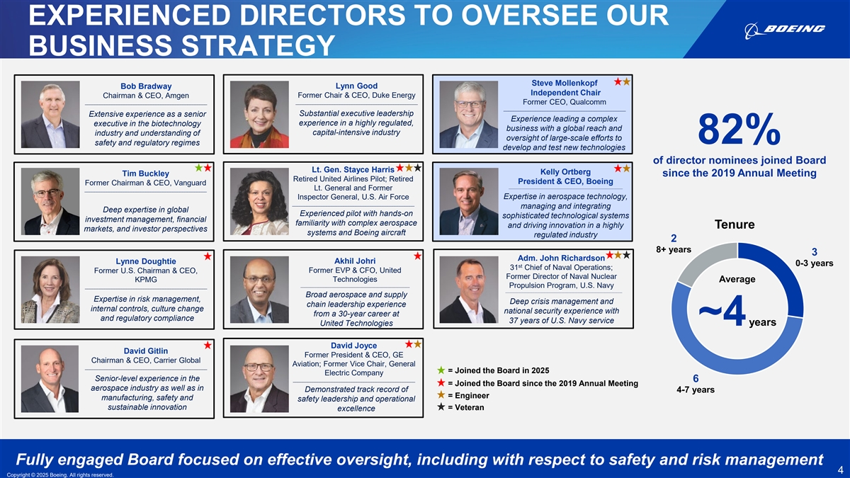 EXPERIENCED DIRECTORS TO OVERSEE OUR BUSINESS STRATEGY Steve Mollenkopf Lynn Good Bob Bradway Independent Chair Chairman & CEO, Amgen Former Chair & CEO, Duke Energy __________________________________________________ __________________________________________________ Former CEO, Qualcomm __________________________________________________ Substantial executive leadership Extensive experience as a senior Experience leading a complex experience in a highly regulated, executive in the biotechnology business with a global reach and capital-intensive industry industry and understanding of oversight of large-scale efforts to 82% safety and regulatory regimes develop and test new technologies of director nominees joined Board Lt. Gen. Stayce Harris Kelly Ortberg Tim Buckley since the 2019 Annual Meeting Retired United Airlines Pilot; Retired President & CEO, Boeing Former Chairman & CEO, Vanguard _______________________________________________________________________________ Lt. General and Former __________________________________________________ Expertise in aerospace technology, Inspector General, U.S. Air Force __________________________________________________ managing and integrating Deep expertise in global Experienced pilot with hands-on sophisticated technological systems investment management, financial familiarity with complex aerospace and driving innovation in a highly Tenure markets, and investor perspectives systems and Boeing aircraft regulated industry 2 8+ years 3 Adm. John Richardson Lynne Doughtie Akhil Johri 0-3 years st 31 Chief of Naval Operations; Former EVP & CFO, United Former U.S. Chairman & CEO, Former Director of Naval Nuclear KPMG Technologies Average _______________________________________________________ __________________________________________________ Propulsion Program, U.S. Navy _________________________________________________________________________________ Broad aerospace and supply Expertise in risk management, Deep crisis management and chain leadership experience internal controls, culture change national security experience with from a 30-year career at and regulatory compliance 37 years of U.S. Navy service United Technologies ~4 years David Joyce David Gitlin Former President & CEO, GE Chairman & CEO, Carrier Global Aviation; Former Vice Chair, General __________________________________________________ = Joined the Board in 2025 Electric Company Senior-level experience in the __________________________________________________ 6 = Joined the Board since the 2019 Annual Meeting aerospace industry as well as in Demonstrated track record of 4-7 years = Engineer manufacturing, safety and safety leadership and operational sustainable innovation = Veteran excellence Fully engaged Board focused on effective oversight, including with respect to safety and risk management 4 Copyright © 2025 Boeing. All rights reserved.