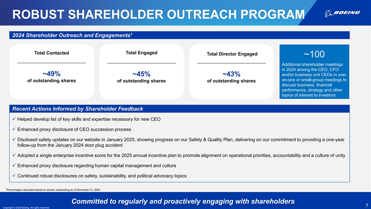 EXECUTIVE SUMMARY New Leadership to Guide the Company Forward § Following a comprehensive and independent search process, Kelly Ortberg was elected as the Company’s CEO effective August 2024; Mr. Ortberg is an experienced leader with a well- earned reputation for building strong teams and running complex engineering and manufacturing companies Independent and Experienced Board of Directors § Experienced Board with highly relevant mix of skills and experience to meet evolving business needs, including areas critical to safety oversight and risk management § Nine of our 11 director nominees have been added since 2019 as part of the Board’s deliberate and strategic refreshment efforts Board Committed to Strengthening Safety and Quality § The Board and Aerospace Safety Committee are actively engaged in overseeing the Company’s comprehensive Safety & Quality Plan aligned to four focus areas: investing in workforce training, simplifying plans and processes, eliminating defects, and elevating our safety and quality culture Pay Opportunities and Outcomes Aligned With Performance § Highly performance-based compensation program; 85% of new CEO target pay in 2024 (his year of hire) was variable § New CEO’s 2025 compensation aligned with the long-term interests of our shareholders and approximates the market median for the role § Long-term incentive awards granted in March 2024 were reduced from target by 22% to match the decline in share price between the Jan. 2024 737-9 door plug accident and grant date § 2024 outcomes demonstrate accountability and alignment with performance: ‒ $0 annual incentive payout for former CEO, David Calhoun, and average NEO payout was 14% of target ‒ 43% of long-term incentive target value realized upon vesting for 2022-2024 period Shareholder Proposal Topics Already Effectively Disclosed and Managed § Our existing management strategies, board oversight, disclosures and policies render the requests put forward in the shareholder proposals unnecessary 2 Copyright © 2025 Boeing. All rights reserved.